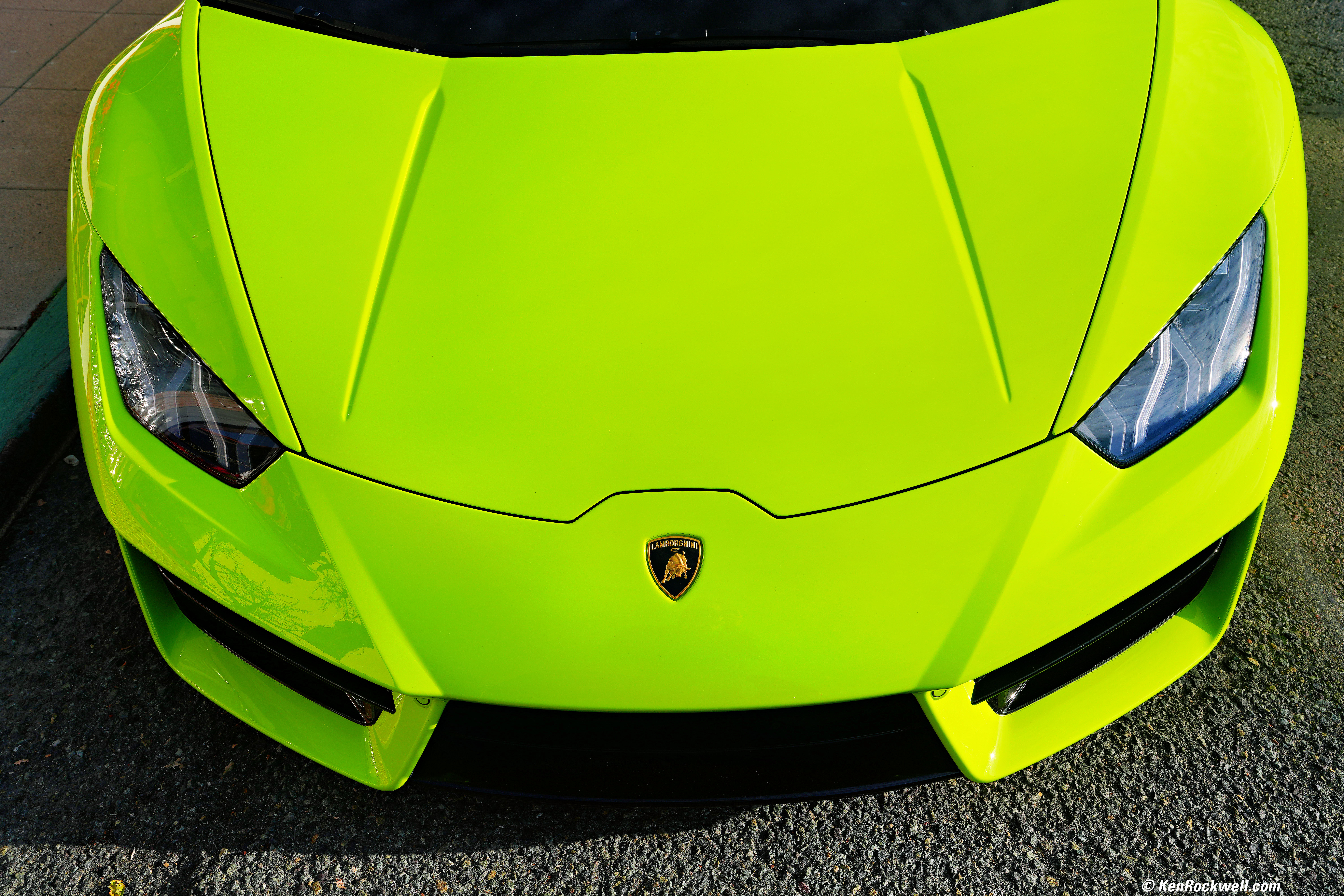 Yellow-Green Lamborghini, 8:50 AM, Saturday, 17 December 2022. Sony A7R V, FE 24-70mm f/2.8 GM II at 30mm at f/8 at 1/400 at Auto ISO 100 (LV 14⅔), Radiant Photo Software. bigger or full resolution 60 MP © 8 MB JPG file. How sharp is this setup? I was amazed at how sharp was the Lamborghini badge: 1,200 × 900 pixel (7.9×) crop from above. bigger or full resolution 60 MP © 8 MB JPG file. Heck, even the dust specks are obvious with this camera and lens.
