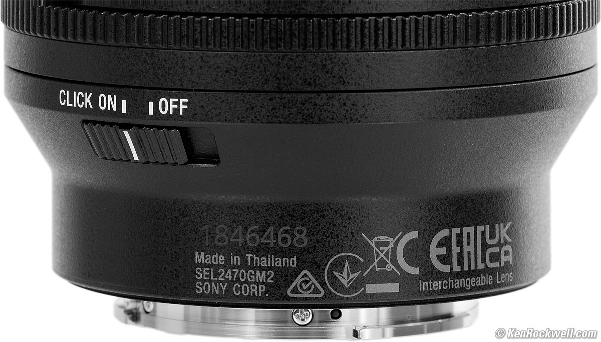 I'd get my FE 24-70mm f/2.8 GM II at Adorama, at Amazon, at B&H or at Crutchfield, or used at eBay if you know How to Win at eBay. Sony FE 24-70mm f/2.8 GM II. bigger. IRIS LOCK Switch user's guide topIt's not an iris lock. It's a block to prevent the aperture ring from moving between f/22 and A. With the switch slid towards the mount as shown, the ring moves all over, with third-stop clicks and stronger clicks at f/22 and A. If IRIS LOCK is slid in the direction of the arrow, the aperture ring can't move between f/22 and A. Lift the switch to lock the ring at A, or to lock it to be sure that it stays between f/2.8 and f/22.