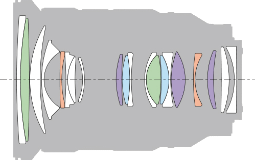 Optics specifications topInternal Optical Construction. ED, Extreme Aspherical (XA), Aspherical and Super ED elements. 20 elements in 15 groups. 2 ED elements: magic Extra-low Dispersion glass for reduced axial secondary chromatic aberration. 2 Extreme Aspherical (XA) elements. Extreme Aspherical (XA) is Sony's secret manufacturing process that yields uncommonly super-accurate and smooth surfaces to 10 nanometers precision; it's not that these elements have crazy shapes. 3 aspherical elements. 2 Super ED elements, which are even better than EDelements. Internal focussing via four motors moving two groups. Multicoated. Front fluorine coating to resist dirt and smudges.