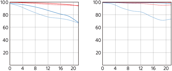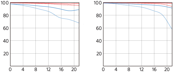 Distortion performance topThere is no distortion with distortion control ON, but there is a lot of distortion at the default setting of distortion control OFF. With no distortion control there is moderately strong and complex barrel distortion at 24mm, moderate and complex pincushion distortion at 35mm and strong pincushion distortion at 50mm and 70mm. If you shoot raw data rather than JPG images, whatever software you use to create visible images from raw data may or may not correct the distortion as is done in-camera as JPGs. You're on your own there; I don't bother with raw data. Use these corrections in Photoshop's lens correction filter with uncorrected images. These aren't facts or specifications, they are the results of my research that requires hours of photography and calculations on the resulting data.