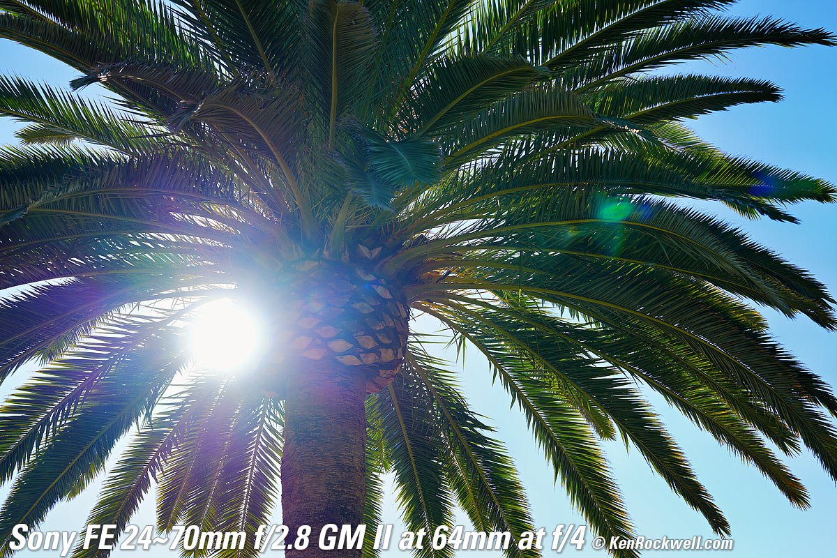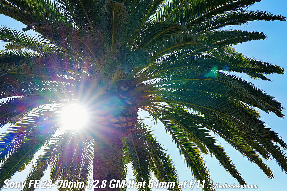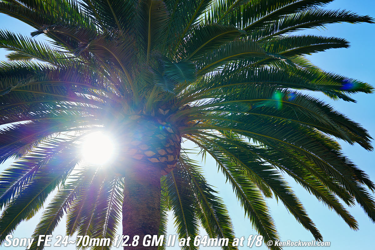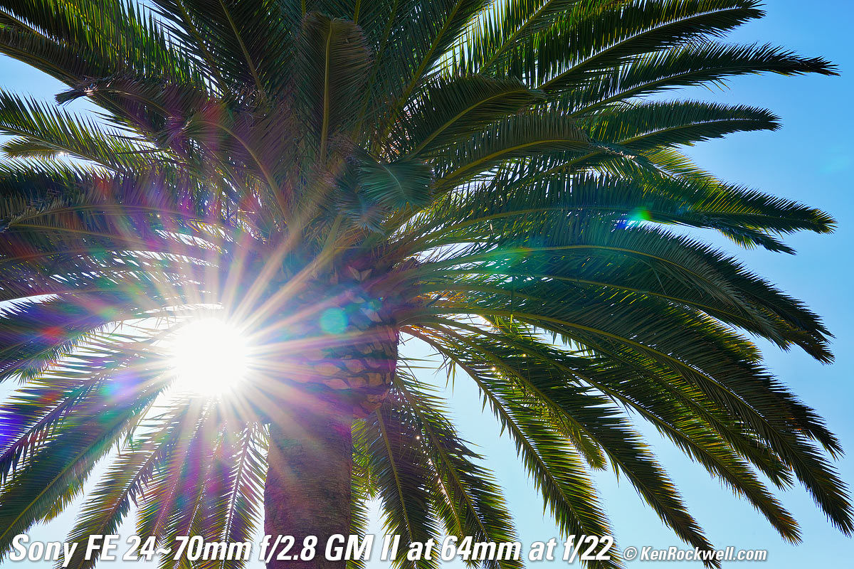 Sunstars performance topWith a 11-bladed rounded diaphragm, I get exquisite 22-pointed sunstars on brilliant points of light at the smaller apertures. Ignore the crazy rainbow dots at small apertures; these are sensor artifacts caused by taking a picture directly of the sun and exposing for the dark underside of a huge palm tree, and using that same palm tree to hide the sky to accentuate the stars. Click any to enlarge: Click any to enlarge.