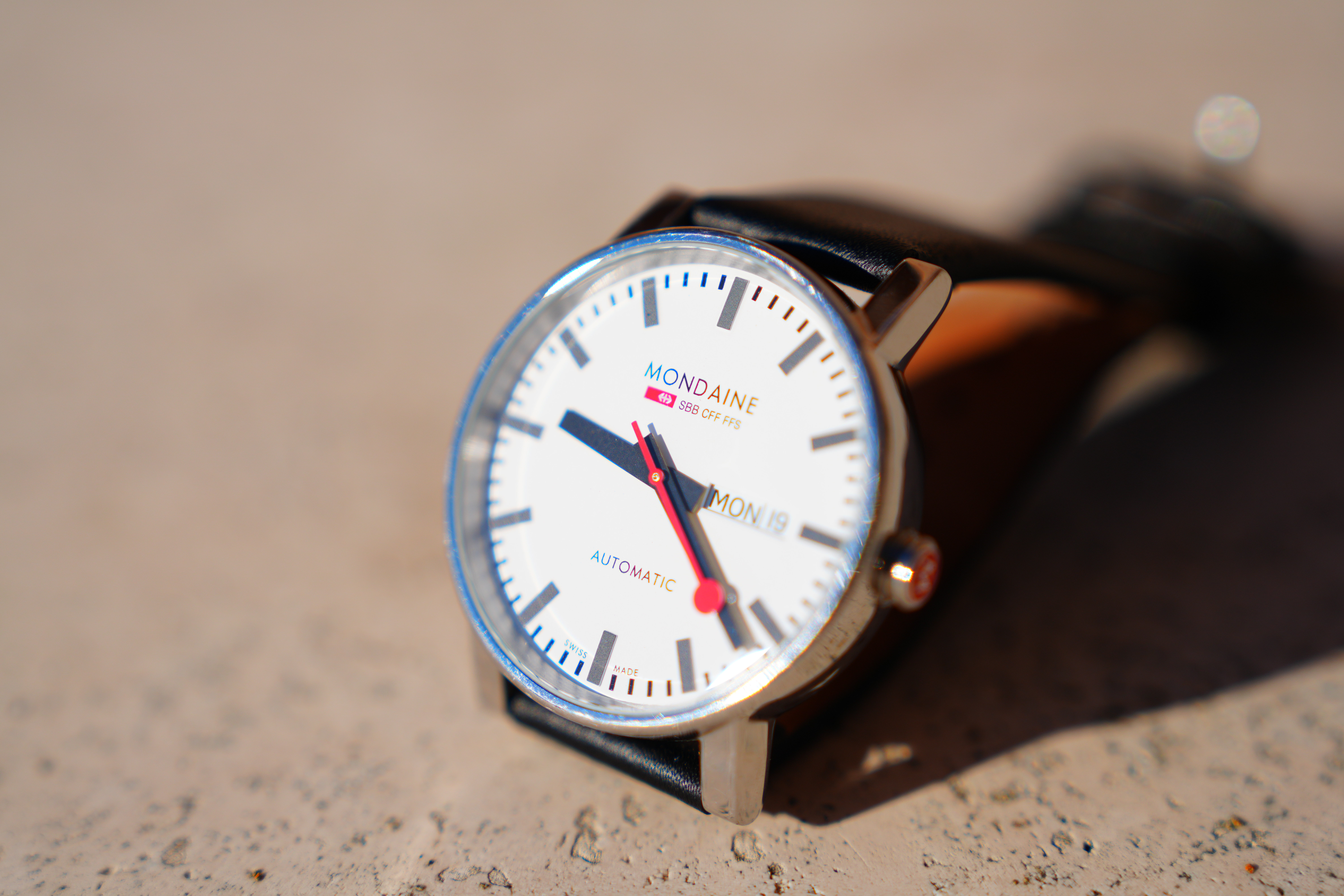 Spherochromatism performance topSpherochromatism, also called secondary spherical chromatic aberration or "color bokeh," is an advanced form of spherical and chromatic aberration in a different dimension than lateral chromatic aberration. It happens mostly in fast normal and tele lenses when spherical aberration at the ends of the color spectrum are corrected differently than in the middle of the spectrum. Spherochromatism can cause colored fringes on out-of-focus highlights, usually seen as green fringes on backgrounds and magenta fringes on foregrounds. Spherochromatism is common in fast lenses of moderate focal length when shooting contrasty items at full aperture. It goes away as stopped down. It has strong cyan/red/amber spherochromatism at macro distances as shown here, but I didn't see any at normal distances. Mondaine A132.30348.11SBB at close-focus distance at 70mm at f/2.8, 19 December 2022. bigger or camera-original © file.