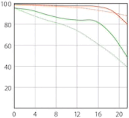 Image Stabilization performance topThis lens has no Optical Image Stabilization (OIS, IS or VR (Vibration Reduction)), instead hoping you have a camera with sensor-shift stabilization. Sensor-shift never works as well as in-lens, as I'll show. "Percent Perfectly Sharp Shots" are the percentage of frames with 100% perfect tripod-equivalent sharpness I get when I'm shooting hand-held while free-standing with no support or bracing. This is a very strict test; in actual shooting at typical print sizes I get acceptable sharpness at much slower speeds, but for the purposes of seeing how much improvement an IS system gives, this is the most precise method. Hand tremor is a random occurrence, so at marginal speeds some frames will be perfectly sharp while others will be in various stages of blur — all at the same shutter speed. This rates what percentage of shots are perfectly sharp, not how sharp are all the frames: