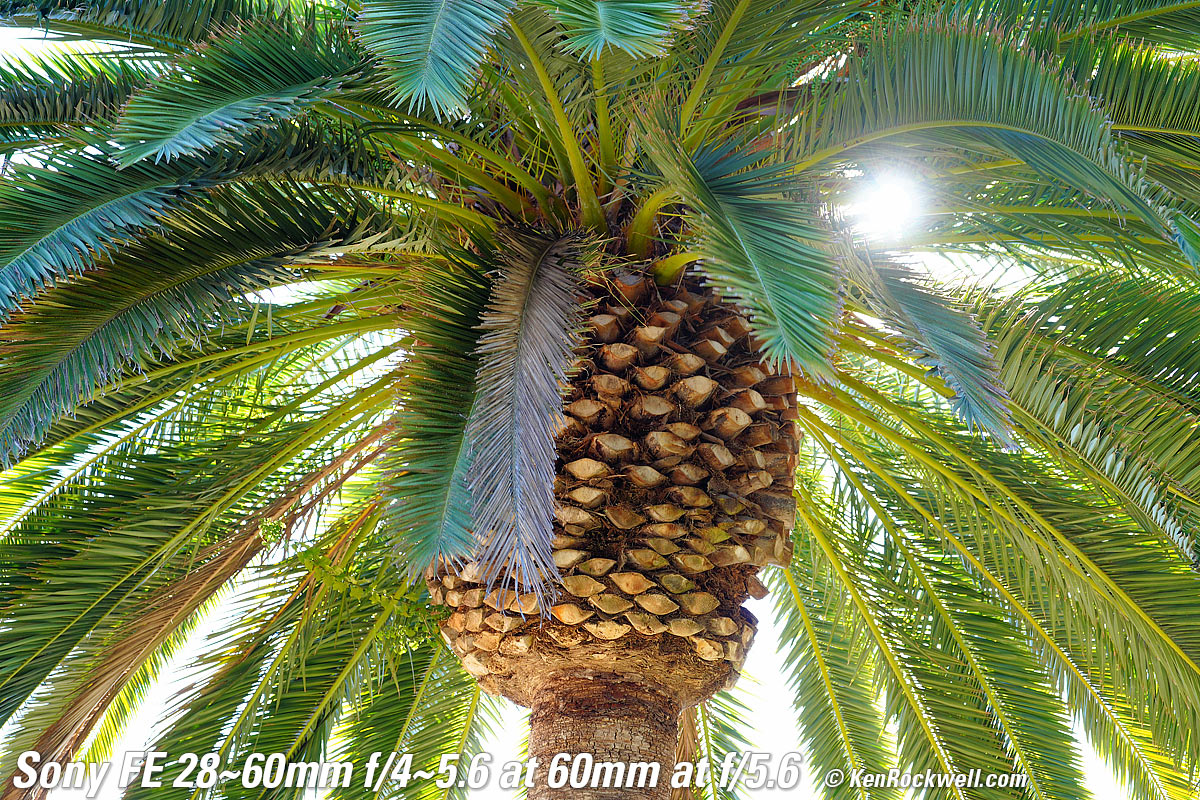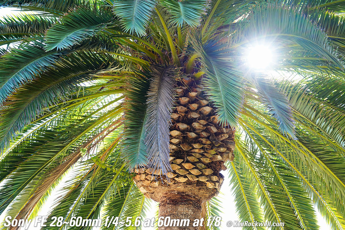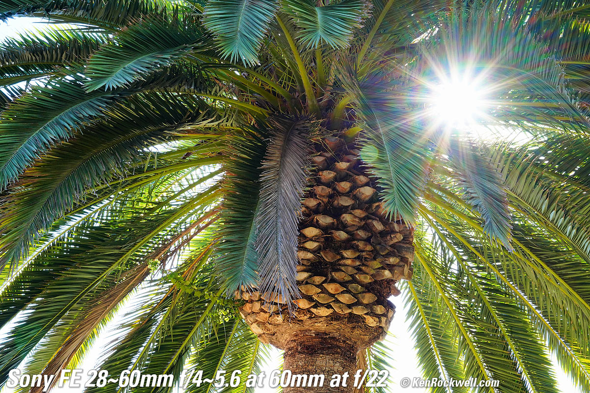 Sunstars performance topI get great 14-pointed sunstars on brilliant points of light, but mostly at smaller apertures because this lens is so slow to begin with. These are shot at 60mm; you'll see similar results at a stop larger at 28mm. Likewise ignore the crazy rainbow effects at small apertures; these are sensor artifacts caused by taking a picture directly of the sun and exposing for the dark underside of a huge palm tree, and using that same palm tree to hide the sky to accentuate the stars. Click any to enlarge: Click any to enlarge.