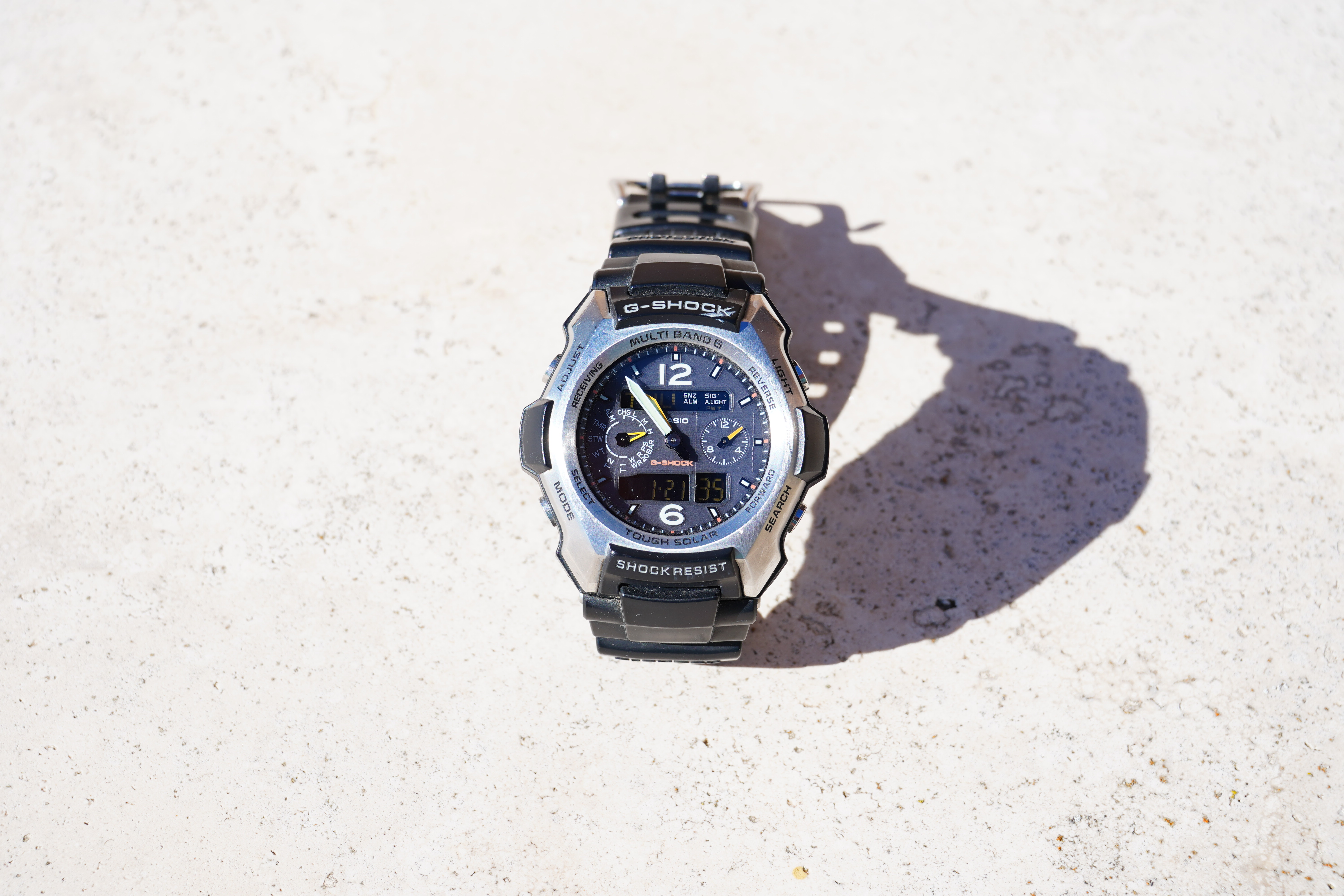 At 60mm at f/5.6Casio G-Shock Solar Atomic Watch at close-focus distance, 21 January 2021. bigger or camera-original © file. It has some residual spherical aberration and spherochromatism that makes it a bit less sharp wide-open here at f/5.6: 1,200 × 900 pixel crop from above. bigger or camera-original © file. If this 1,200 × 900 pixel crop is about 3" (7.5cm) wide on your screen, then the complete image printed at this same large magnification would be about 10 × 15" (25 × 38cm). If this 1,200 × 900 pixel crop is about 6" (15cm) wide on your screen, then the complete image printed at this same extreme magnification would be about 20 × 30" (50 × 75cm). If this 1,200 × 900 pixel crop is about 12" (30cm) wide on your screen, then the complete image printed at this same insanely high magnification would be about 40 × 60" (1 × 1.5 meters).