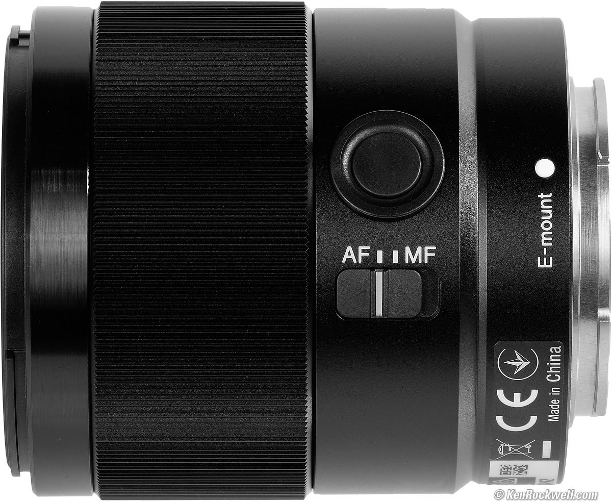 Sony FE 35mm f/1.8. bigger or fit-to-screen. The programmable button, usually set to focus lock, is a nice touch, but unfortunately there's no Image Stabilization switch. Even though this lens has no optical stabilization it would be nice to have a switch for the camera's stabilization on the lens. The programmable button is on the side of the lens. In this photo I've rotated this side of the lens up a bit for clarity; if you saw the lens on a camera the button is pointing directly out to the side and the AF/MF switch is below this. The worst thing is that the AF/MF switch is in the wrong place: on the lower half of the barrel. It's not on the top of the barrel where my thumb rests; instead I have to stop and grope around for it.