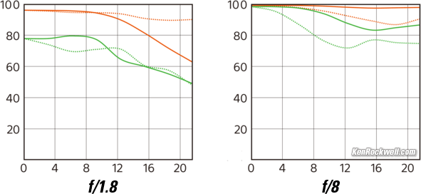 SharpnessLens sharpness has nothing to do with picture sharpness; every lens made in the past 100 years is more than sharp enough to make super-sharp pictures if you know what you're doing. The only limitation to picture sharpness is your skill as a photographer. It's the least talented who spend the most time worrying about lens sharpness and blame crummy pictures on their equipment rather than themselves. Skilled photographers make great images with whatever camera is in their hands; I've made some of my best images of all time with an irreparably broken camera! Most pixels are thrown away before you see them, but camera makers don't want you to know that. If you're not getting ultra-sharp pictures with this, be sure not to shoot at f/11 or smaller where all lenses are softer due to diffraction, always shoot at ISO 100 or below because cameras become softer at ISO 200 and above, avoid shooting across long distances over land which can lead to atmospheric heat shimmer, be sure everything is in perfect focus, set your camera's sharpening as you want it (I set mine to the maximum) and be sure nothing is moving, either camera or subject. If you want to ensure a soft image with any lens, shoot at f/16 at ISO 1,600 at default sharpening in daylight of subjects at differing distances in the same image. This lens is super sharp all over except that on a 42MP A7R III it's not quite as sharp in the lab wide-open at f/1.8 in the far corners, but so what, it's super sharp for real-world picture taking under all conditions. This isn't 1968 anymore; lenses are super-sharp today. Sony's MTF charts at 10 cyc/mm and 30 cyc/mm, radial (solid) and tangential (dotted).