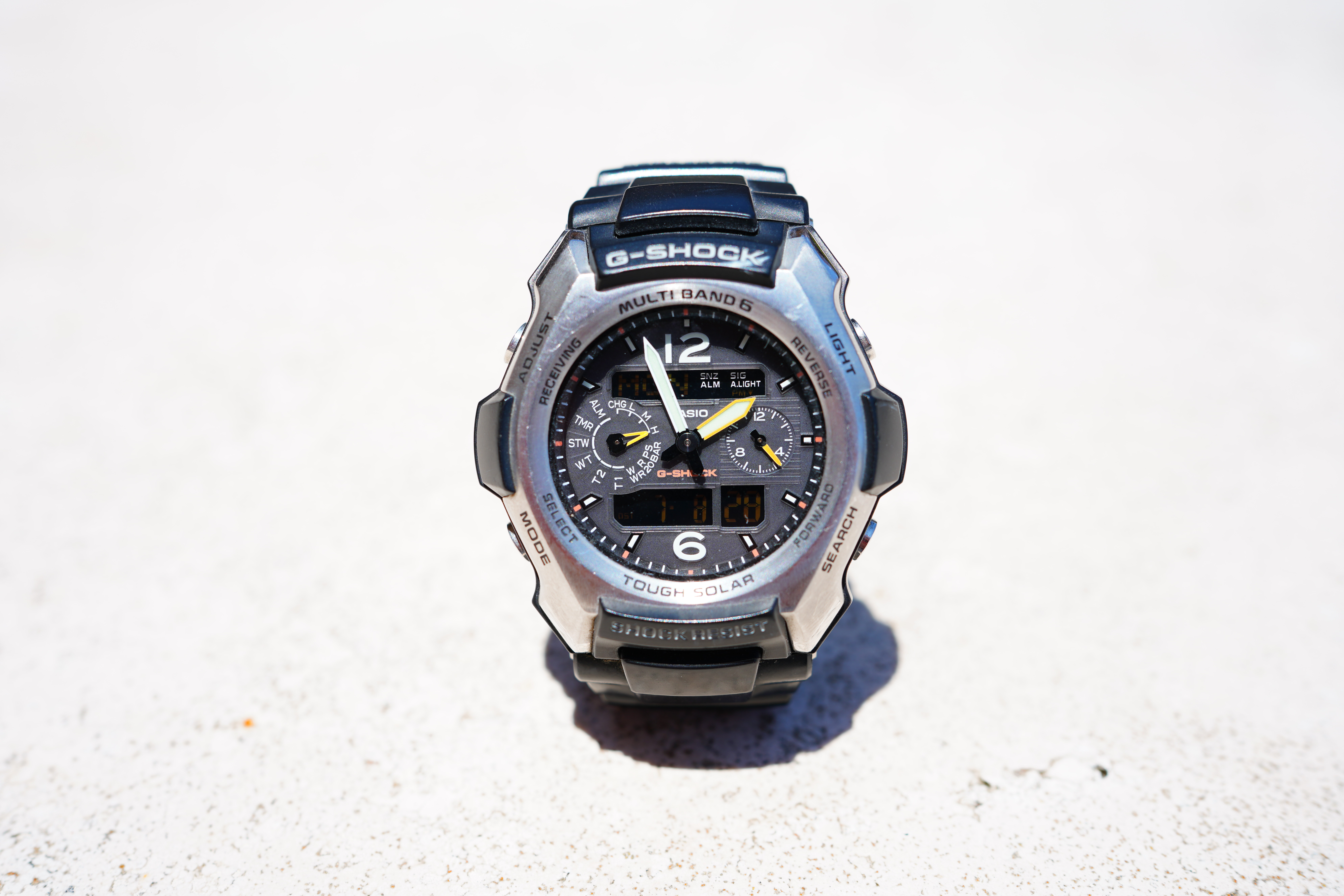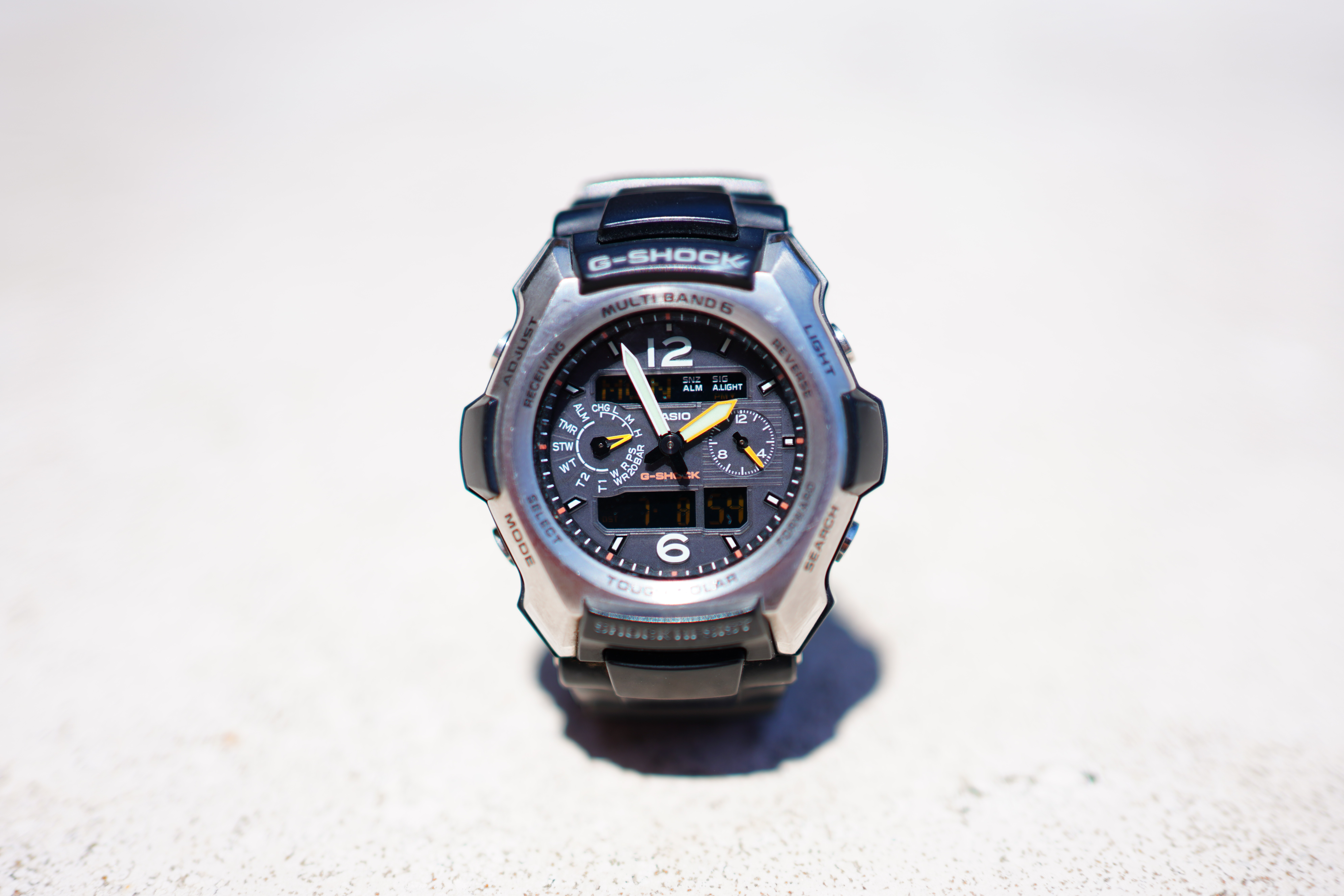 Wide-open at f/1.8Casio G-Shock Solar Atomic Watch at close-focus distance at f/1.8, 08 July 2019. bigger or camera-original 42MP © file.