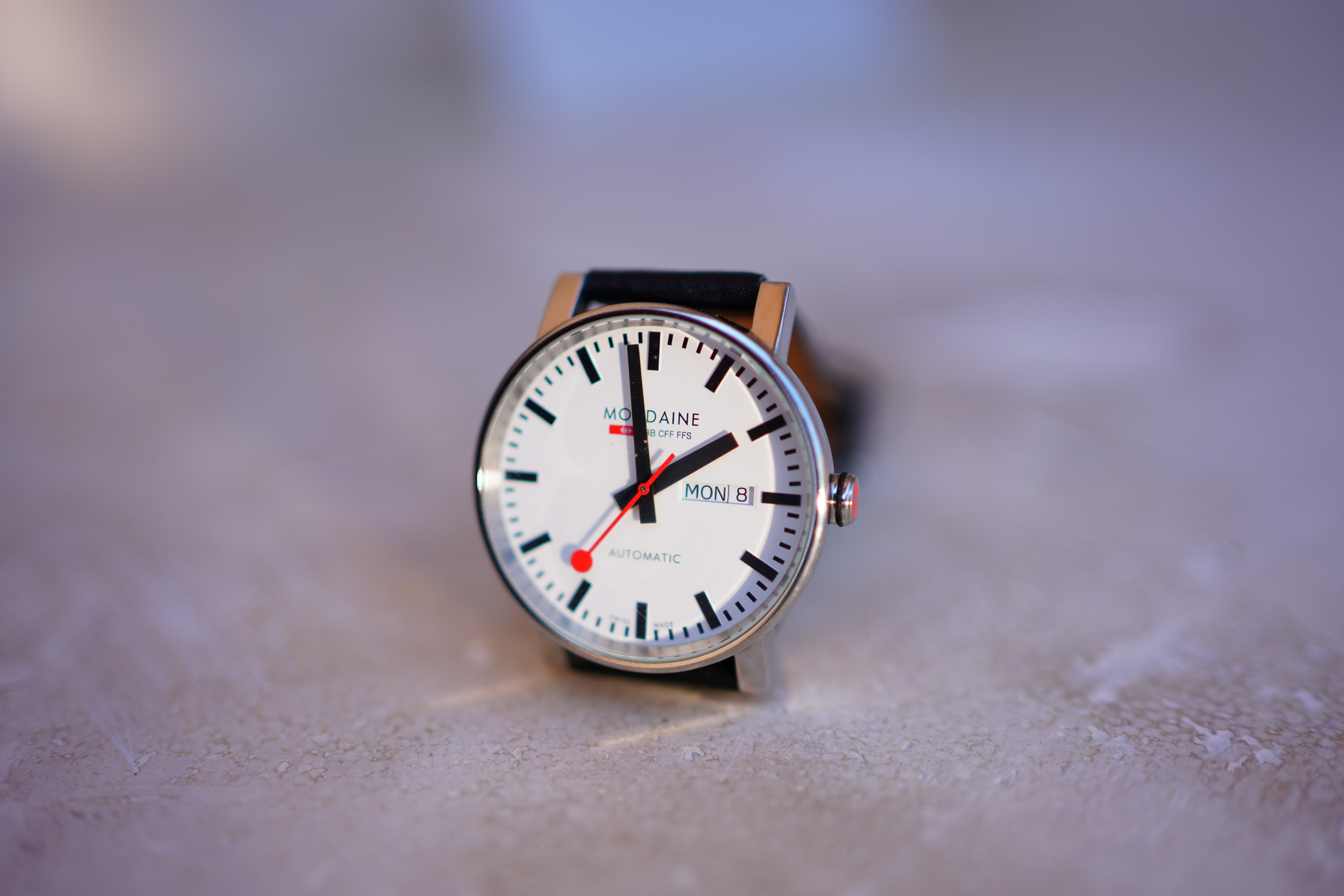 SpherochromatismSpherochromatism, also called "color bokeh" by laymen, is an advanced form of chromatic aberration in a different dimension than lateral color. It can cause colored fringes on out-of-focus highlights, usually seen as green fringes on backgrounds and magenta fringes on foregrounds. Spherochromatism is common in fast lenses of moderate focal length when shooting contrasty items at full aperture. It goes away as stopped down. This lens has vividly strong green-magenta spherochromatism that's easy to see if you know how to look for it. It's so strong that I see some even at f/5.6 (not shown here). Mondaine A132.30348.11SBB at close-focus distance at f/1.8, smokin' hot 08 July 2019. bigger or camera-original © file.
