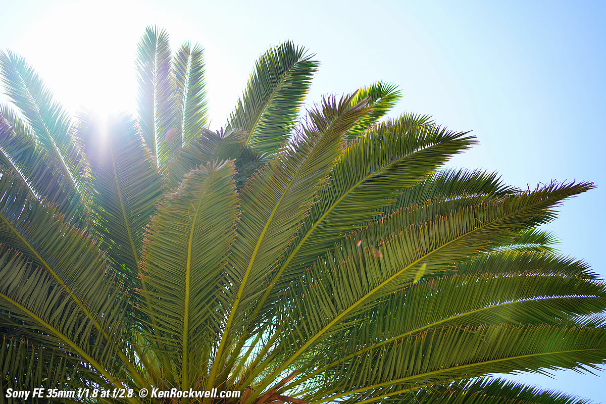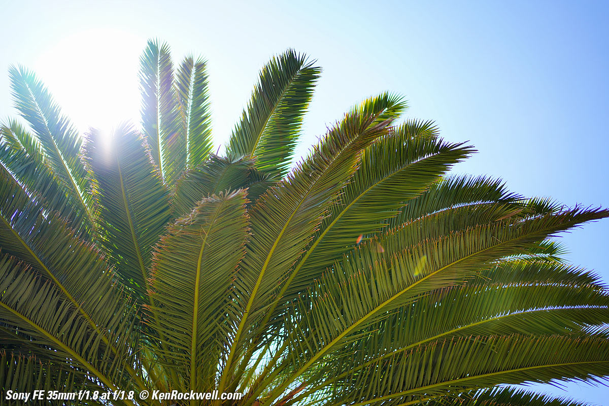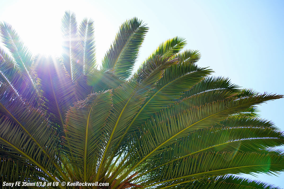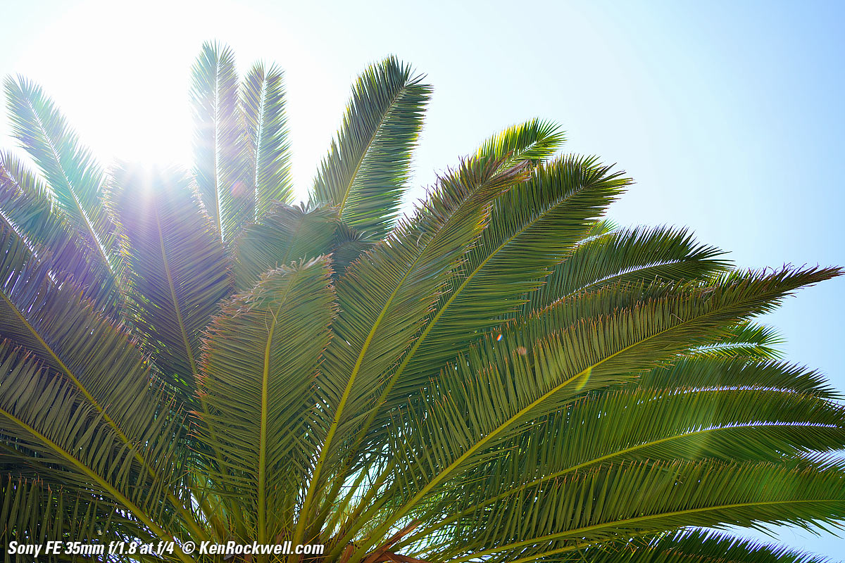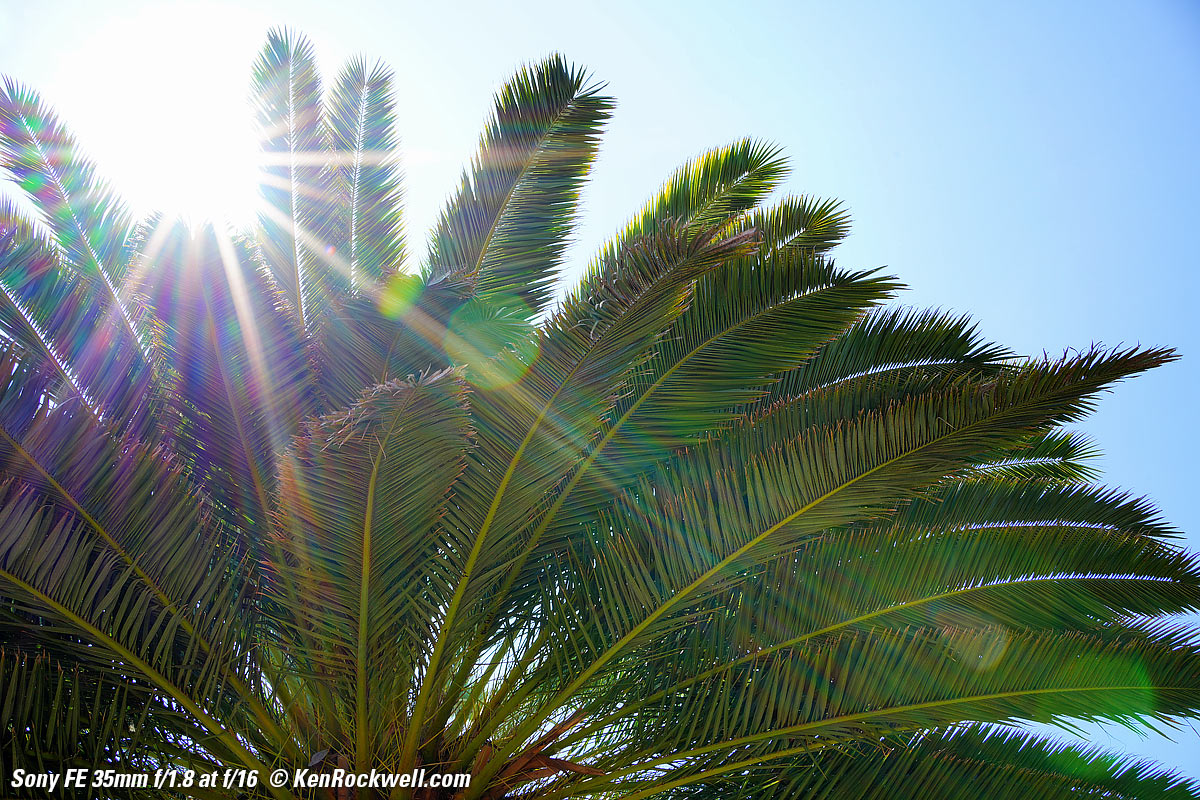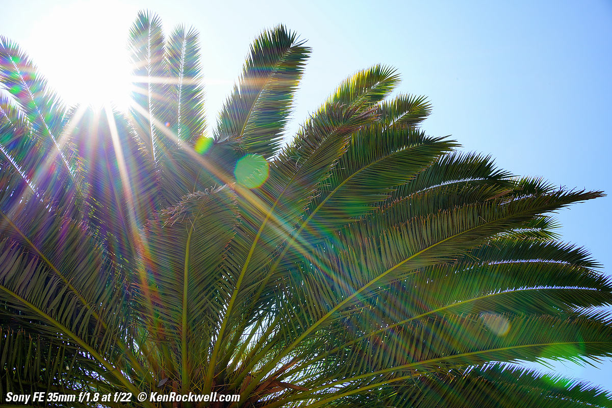 SunstarsWith a 9-bladed rounded diaphragm I get 18-pointed sunstars on brilliant points of light mostly at the smallest apertures. Ignore the vertical smears at the largest apertures, these are sensor artifacts called interline transfer smears; they're not lens defects. Also ignore the crazy rainbow effects at the smallest apertures, these are different sensor artifacts caused by taking a picture directly of the sun and exposing for the dark underside of a palm tree!
