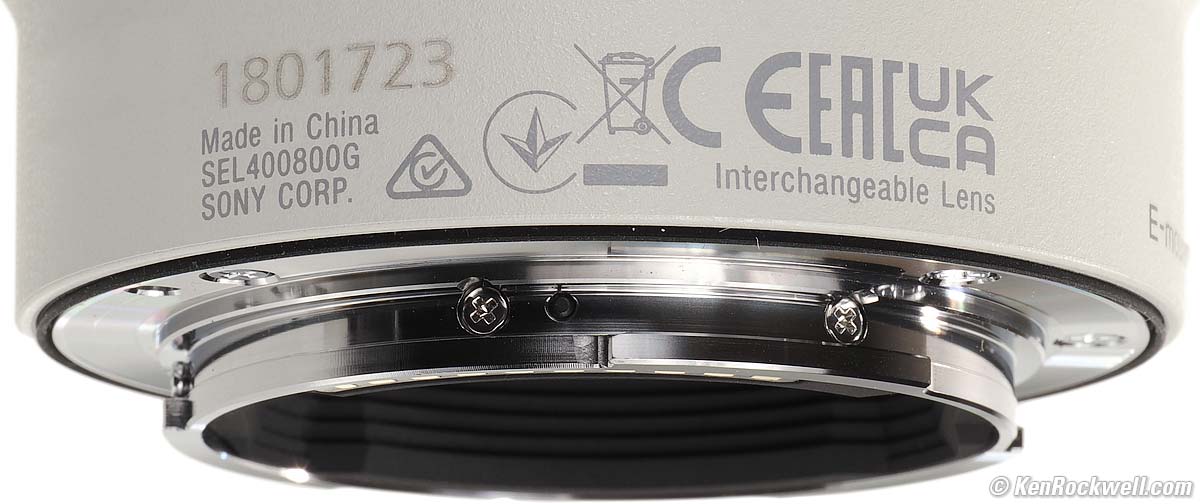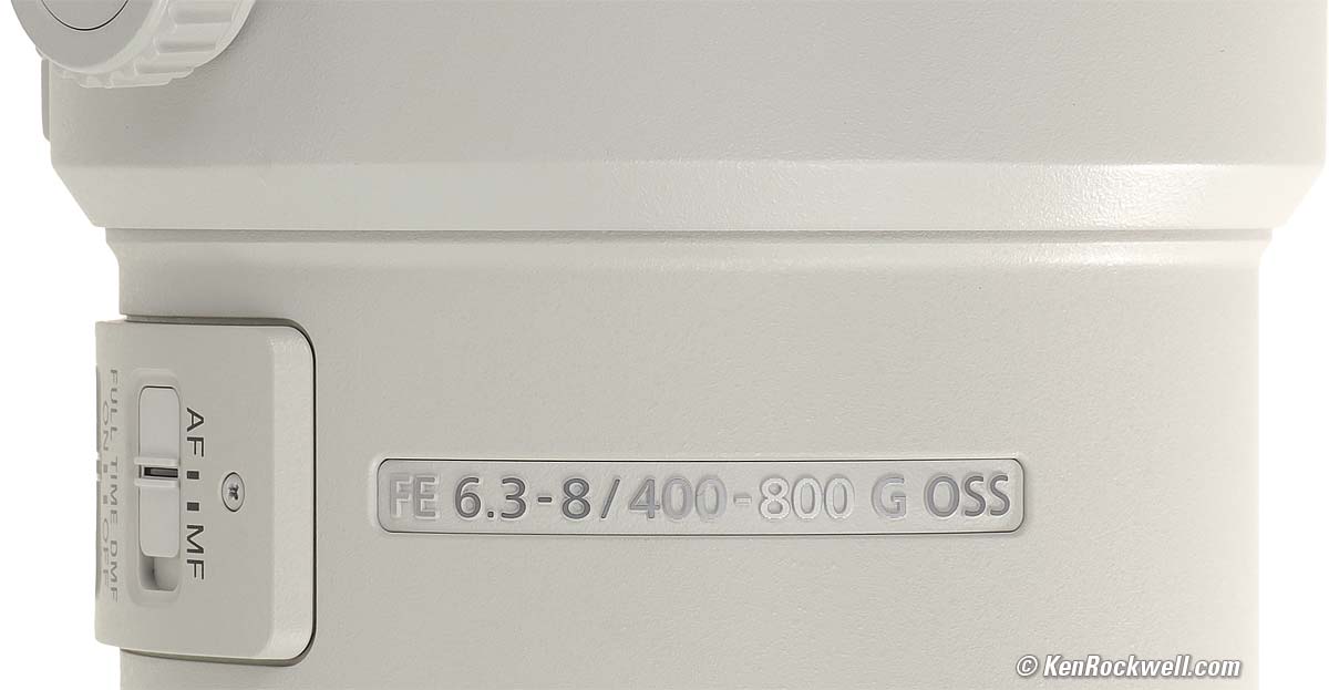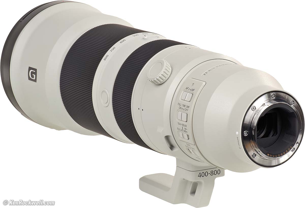 Sony FE 400-800mm G OSSf/6.3-8 (2025 ~ today)Sony's longest lens, but only zooms out to 400mm. Works great with teleconverters out to 1,600mm! Sample Images Intro New Good Bad Missing Specifications Accessories Performance Compared User's Guide Recommendations Sony: A9 III A1 II A1 A9 II A7R V A7R IV A7 V A7 IV A7 III A7S III A7CR A7C II A7c FX3 FX2 ZV-E1 A6700 A6600 A6400 ZV-E10 II ZV-E10 ZV-1 II RX1R III RX10/4 RX100/7 Flash Lenses Sony FE 400-800mm f/6.3-8 G OSS (105mm filters, 87 oz./2,460g, 5.8-11.3'/1.8-3.5m close focus, 0.23× macro ratio, $2,898). bigger. I'd get mine at B&H or and at Adorama, or get it used if you know How to Win at eBay. This 100% all-content, junk-free website's biggest source of support is when you use those or any of these links to my personally approved sources I've used myself for way over 100 combined years when you get anything, regardless of the country in which you live — but I receive nothing for my efforts if you take the chance of getting it elsewhere. Sony does not seal its boxes in any way, so never buy at retail or any other source not on my personally approved list since you'll have no way of knowing if you're missing accessories, getting a defective, damaged, returned, dropped, incomplete, gray-market, store demo or used lens — and my personally approved sources allow for 100% cash-back returns for at least 30 days if you don't love your new ultratele. I've used many of these sources since the 1970s because I can try it in my own hands and return it if I don't love it, and because they ship from secure remote warehouses where no one gets to touch your new lens before you do. Buy only from the approved sources I've used myself for decades for the best prices, service, return policies and selection.