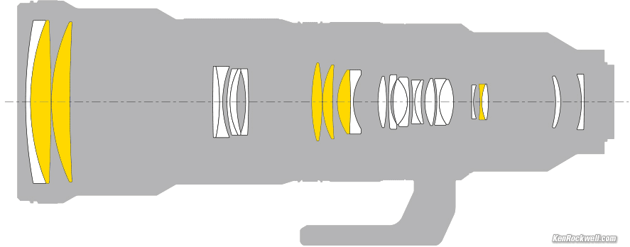 Optics specifications topInternal Optical Construction. ED elements. 27 elements in 19 groups. 6 ED elements: magic Extra-low Dispersion glass for reduced axial secondary chromatic aberration. Fluorine coating to resist dirt and smudges. There are quite a few black baffles and stops in the barrel to catch flare.