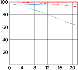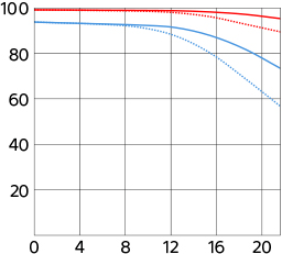 Sony's MTF at f/1.4 and f/8 at 10 cyc/mm and 30 cyc/mm, radial (solid) and tangential (dotted). While it's usually valid to compare rated MTFs between different lenses of a similar age from the same maker, every maker measures or simply calculates MTF very differently, and therefore one cannot compare these curves between brands. Sony seems to calculate and choose to ignore diffraction, while others don't, which lets these lenses hug the mythical 100% line for show, while other brands don't.