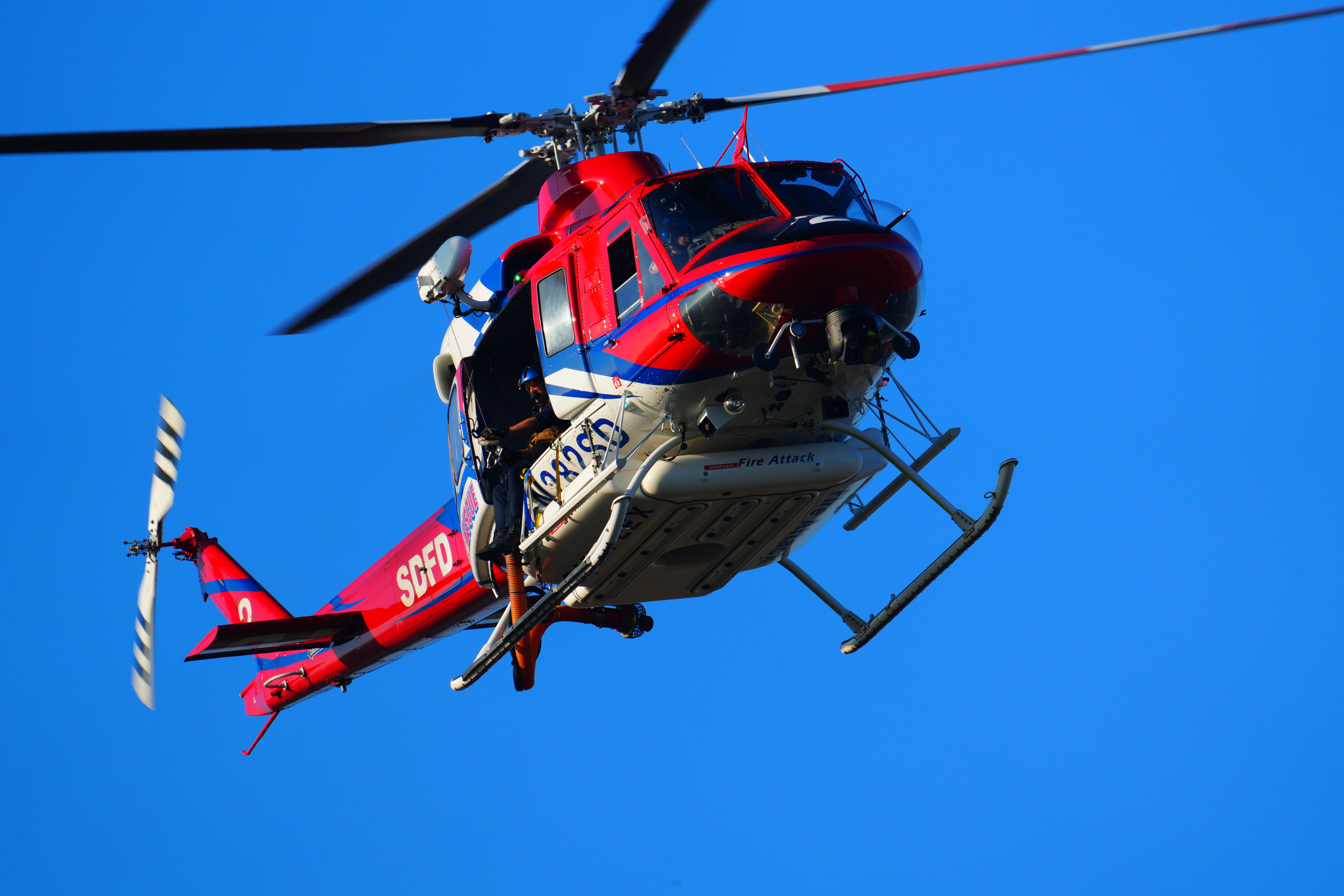 Sample Images topSample Images Intro New Good Bad Missing Specifications Accessories Performance Compared User's Guide Recommendations More samples throughout this review at Bokeh, Falloff, Macro, Sharpness, Spherochromatism and Sunstars. These are just snapshots; my real work is in my Gallery. These are all shot hand-held as STANDARD JPGs; no tripods, no FINE or EXTRA FINE JPGs or RAW files were used or needed. This is an actual rescue of a real guy I know that unexpectedly came up over me as I stood near a canyon; this was not a practice or glory shoot set up in advance; this is a real rescue to take a disabled person out of a canyon and bring him to the ambulance waiting on the street to take him to the hospital: Actual mission (not practice) rescuing a man from a canyon, 4:11 PM, Saturday, 01 February 2025. Sony A7R V, Sony FE 400-800mm G OSS at 800mm at f/8 hand-held at 1/1,000 at Auto ISO 400 (LV 14.0), Radiant Photo software to fill in the shadows under the helicopter. bigger or camera-original 60 MP © 6.7 MB JPG file.