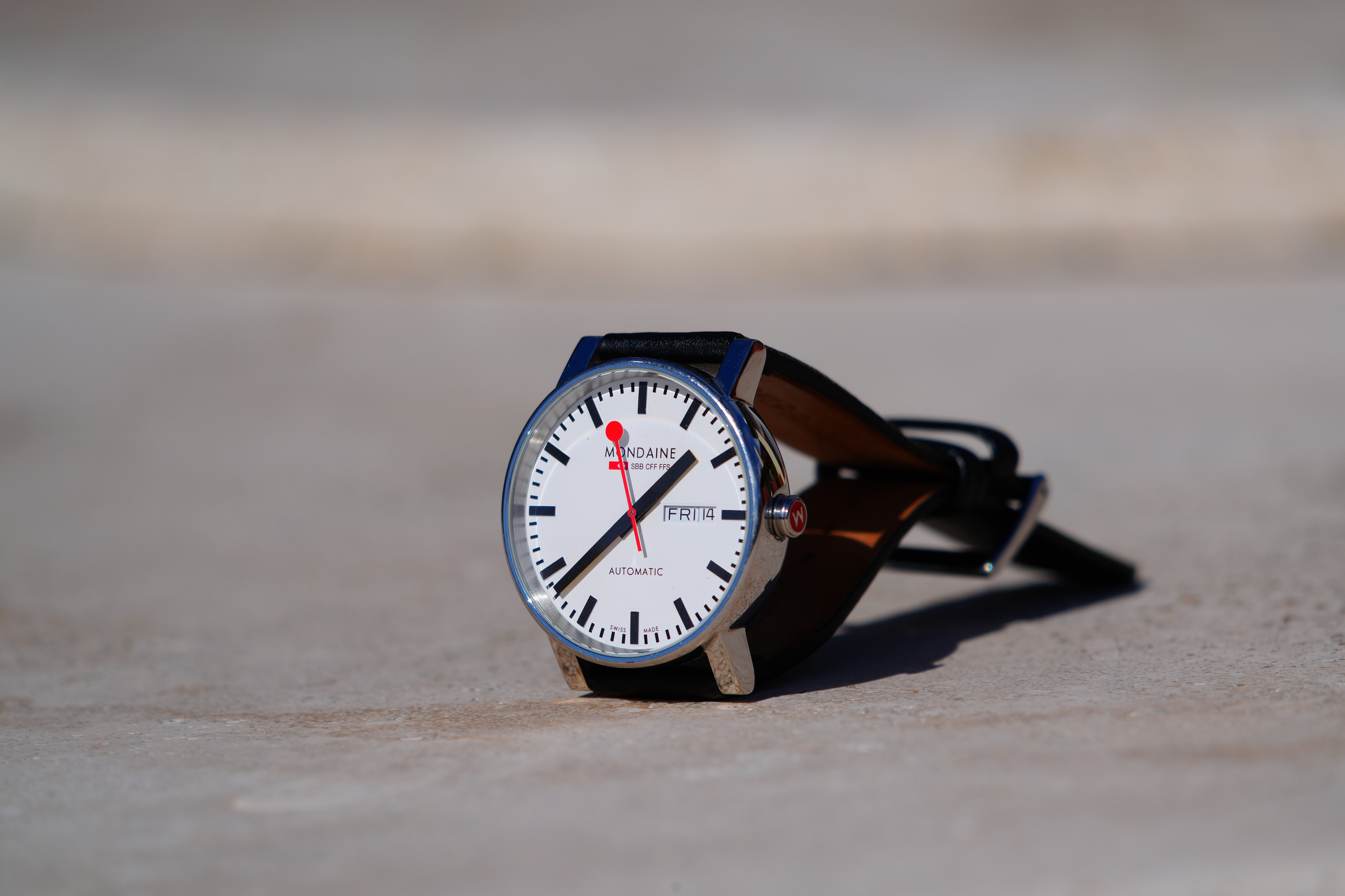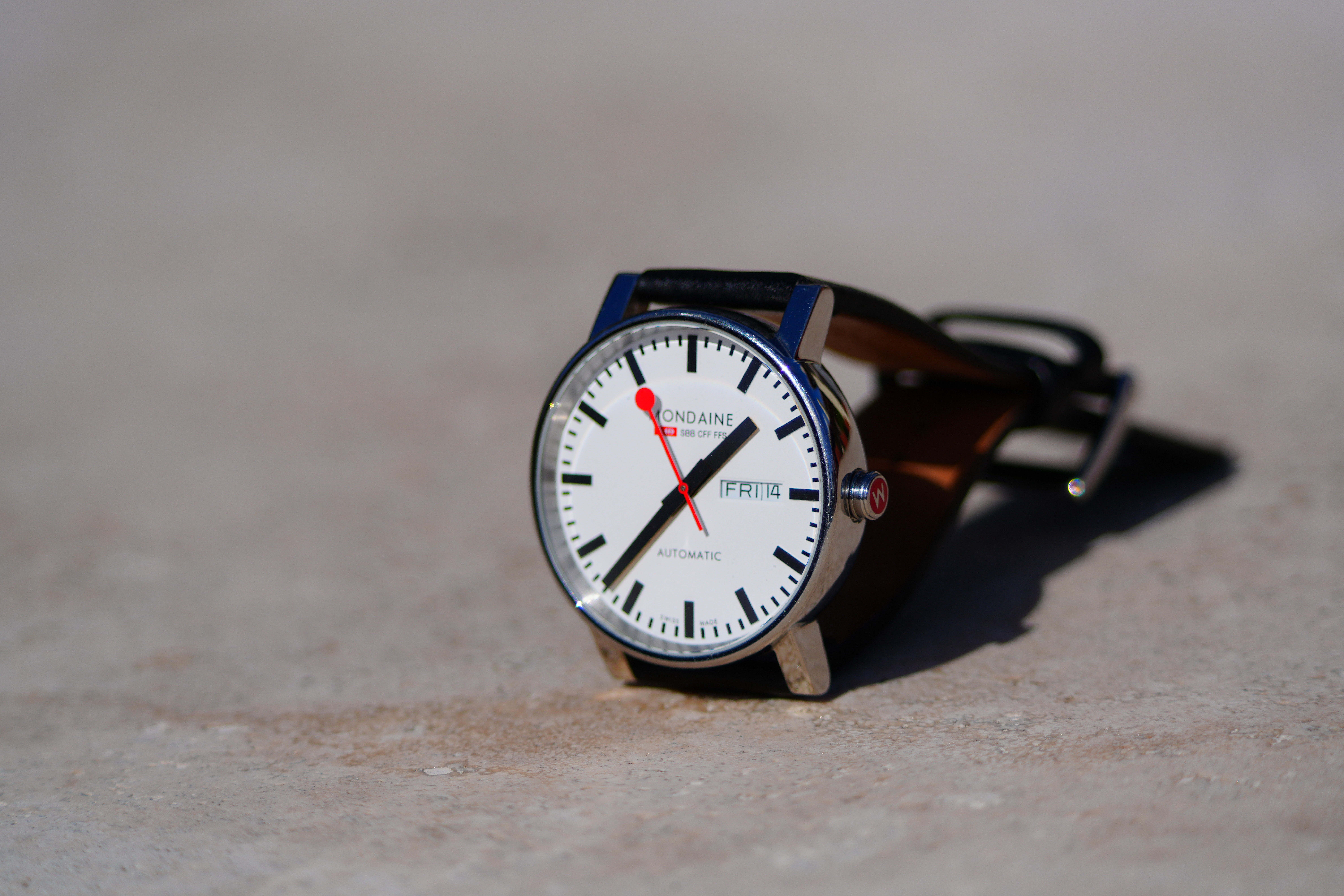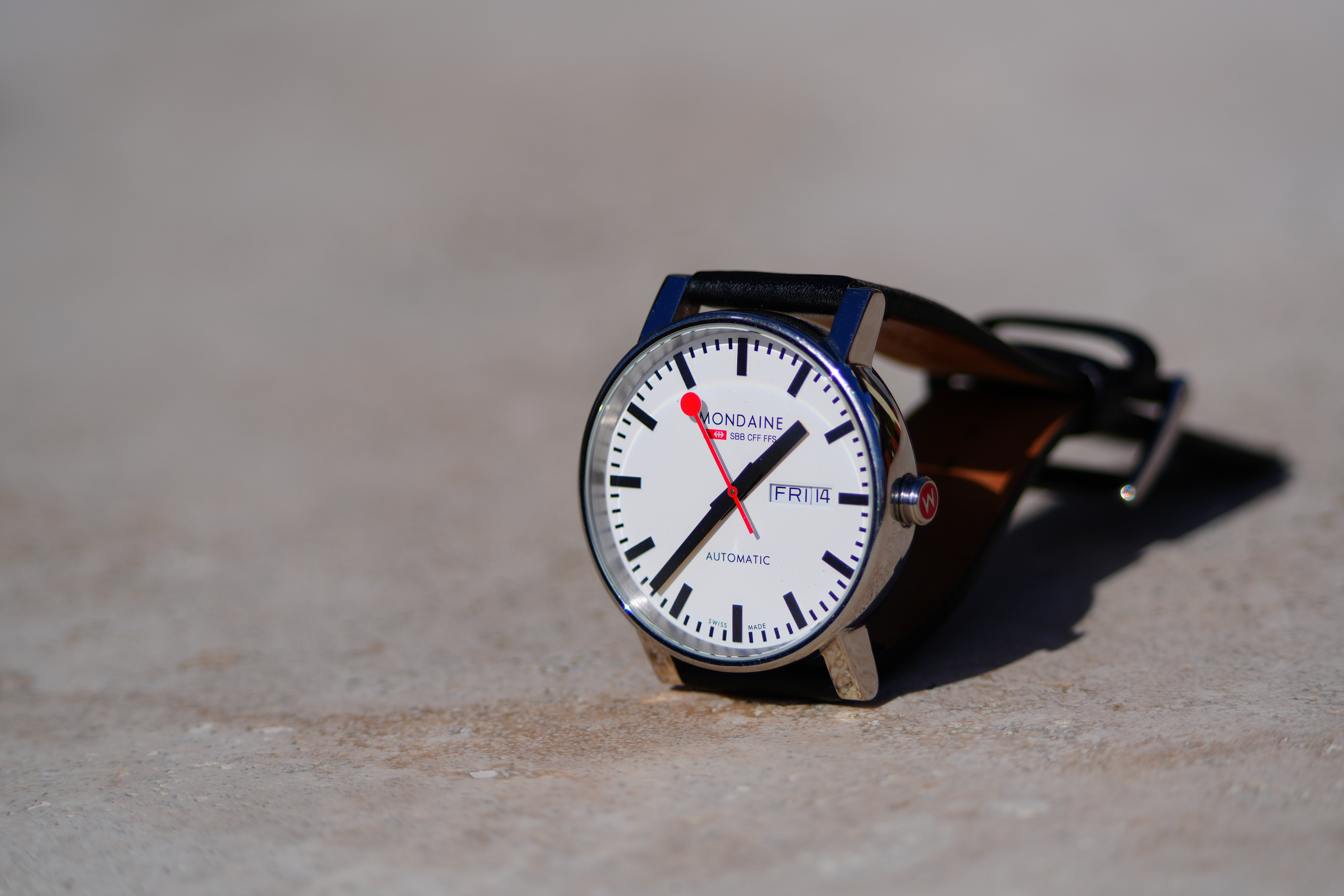 At 400mmMondaine A132.30348.11SBB at close-focus distance, 14 February 2025. Sony A7R V, Sony FE 400-800mm G OSS at 400mm at f/6.3 hand-held at 1/1,600 at Auto ISO 100 (LV 16.0). bigger or camera-original © file.