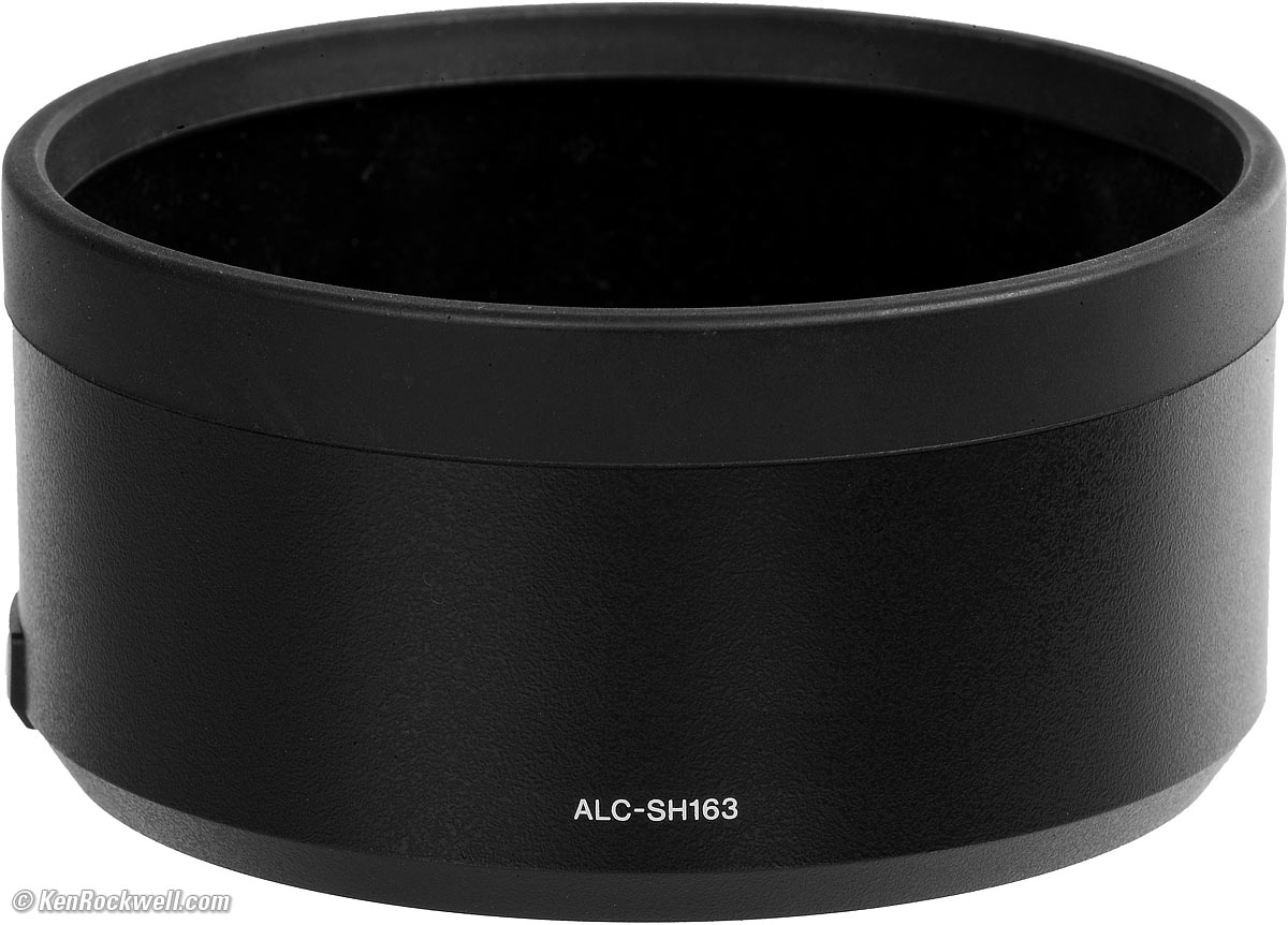 ALC-SH163 Hood and FE 50mm f/1.2 GM. bigger. ALC-SH163 hood included. It has a solid locking pawl so it won't fall off your lens, and has a sturdy rubber bumper on the front. Good job, Sony.