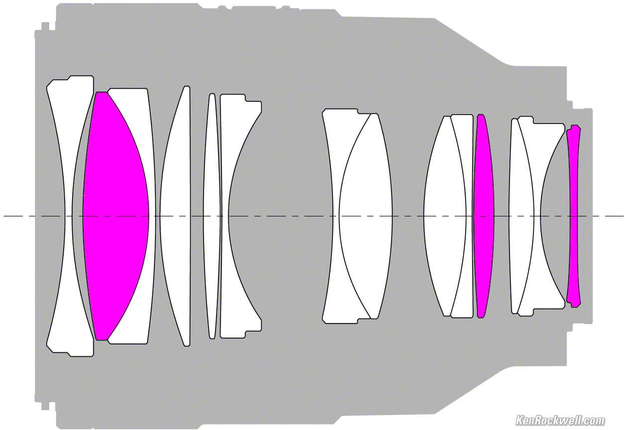 Optics specifications topSony 50/1.2 internal construction. Extreme Aspherical elements. 14 elements in 10 groups. 3 "Extreme" aspherical elements, which really are: Sony has a magic way to make these that give much more accurate and smooth surfaces so they beget much smoother bokeh than other brands of aspherical lenses. Nano AR Coating II anti reflection coating on the inside of the first element. Front fluorine coating to resist dirt, dust and fingerprints.