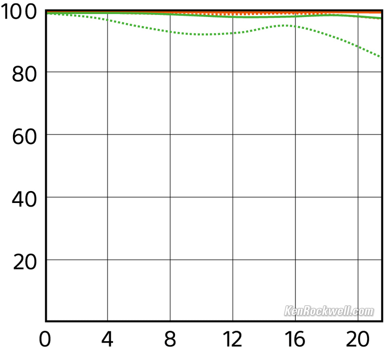 Distortion performance topThe 50/1.2 has moderately strong pincushion distortion, which completely goes away with in-camera correction. Be careful if you shoot raw. Many kinds of software won't know Sony's secret sauce to correct this, so if this is important and you shoot raw, test your workflow first. JPGs are always corrected if you set your camera that way. If uncorrected, it corrects with a value of -2.5 in Photoshop's lens correction filter, but it's complex distortion so there is some waviness left after Photoshops's simple correction. Just use the camera's own correction for the best results.