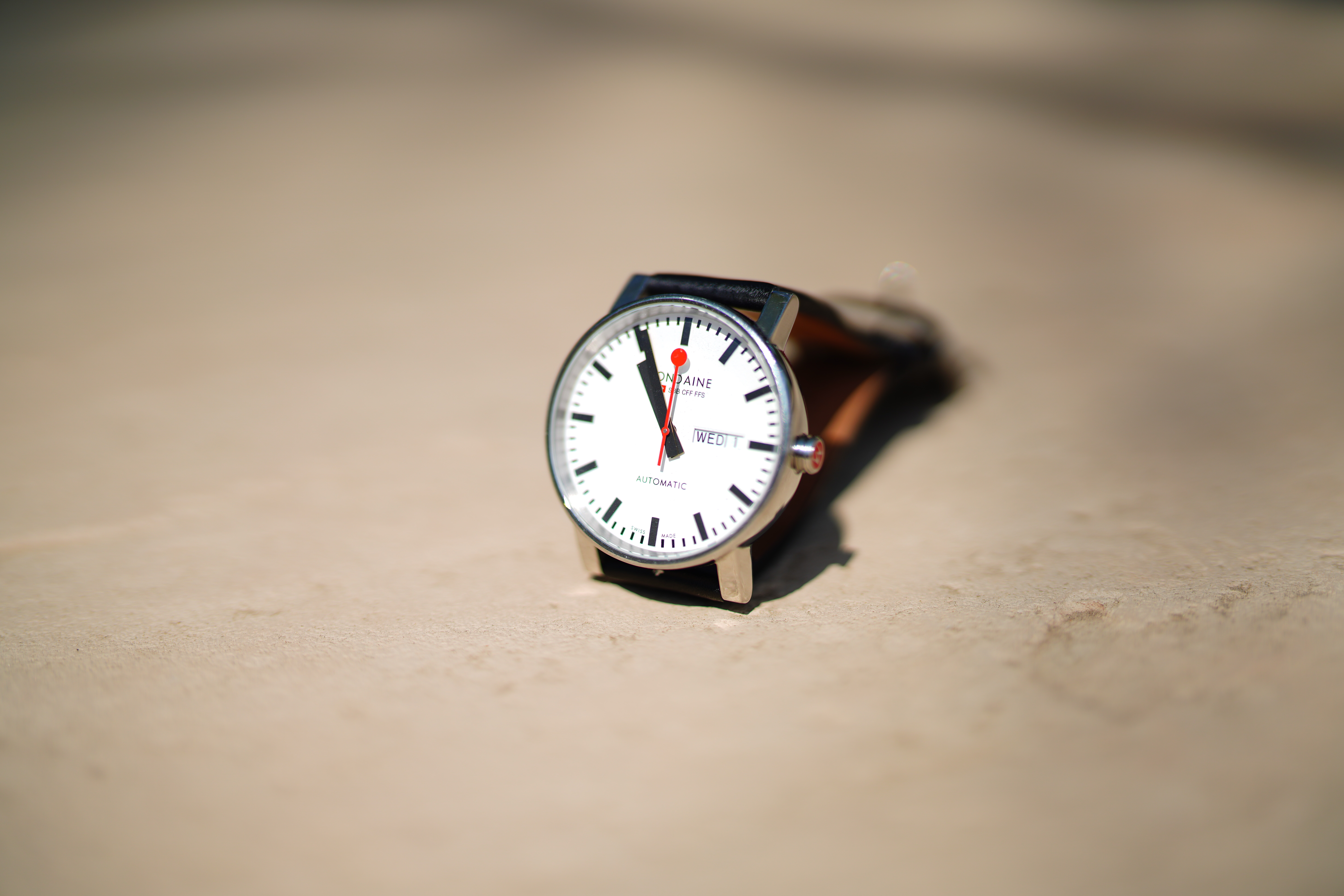 Spherochromatism performance topSpherochromatism, also called secondary spherical chromatic aberration or "color bokeh," is an advanced form of spherical and chromatic aberration in a different dimension than lateral chromatic aberration. It happens mostly in fast normal and tele lenses when spherical aberration at the ends of the color spectrum are corrected differently than in the middle of the spectrum. Spherochromatism can cause colored fringes on out-of-focus highlights, usually seen as green fringes on backgrounds and magenta fringes on foregrounds. Spherochromatism is common in fast lenses of moderate focal length when shooting contrasty items at full aperture. It goes away as stopped down. It has the usual amount of spherochromatism I see in lenses like this today. It actually can help with bokeh if your background is green foliage: Mondaine A132.30348.11SBB at close-focus distance at f/1.2, 01 September 2021. A7R IV, wide-open at f/1.2 at 1/8,000 at ISO 50 (LV 14.5). bigger or camera-original © JPG file.