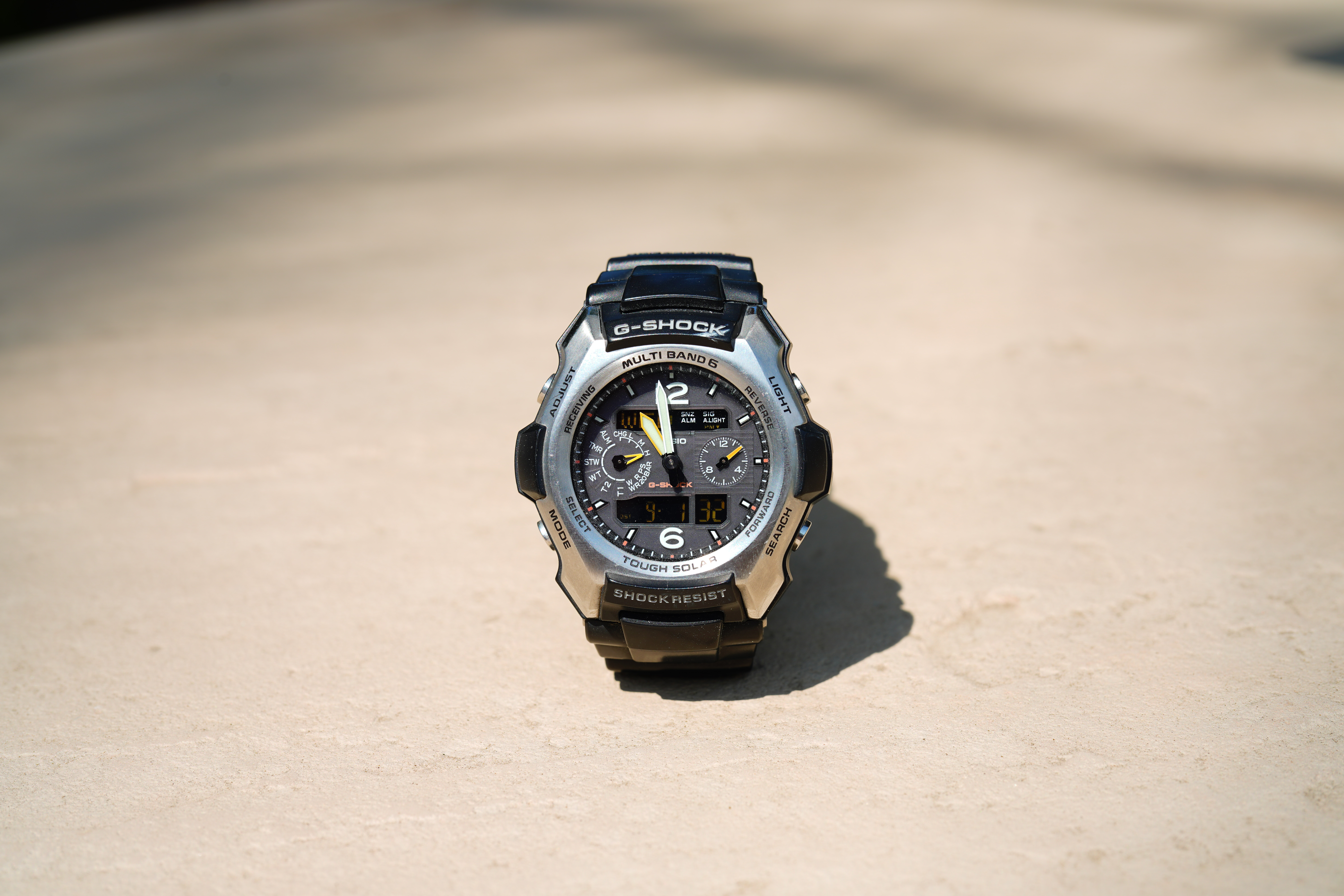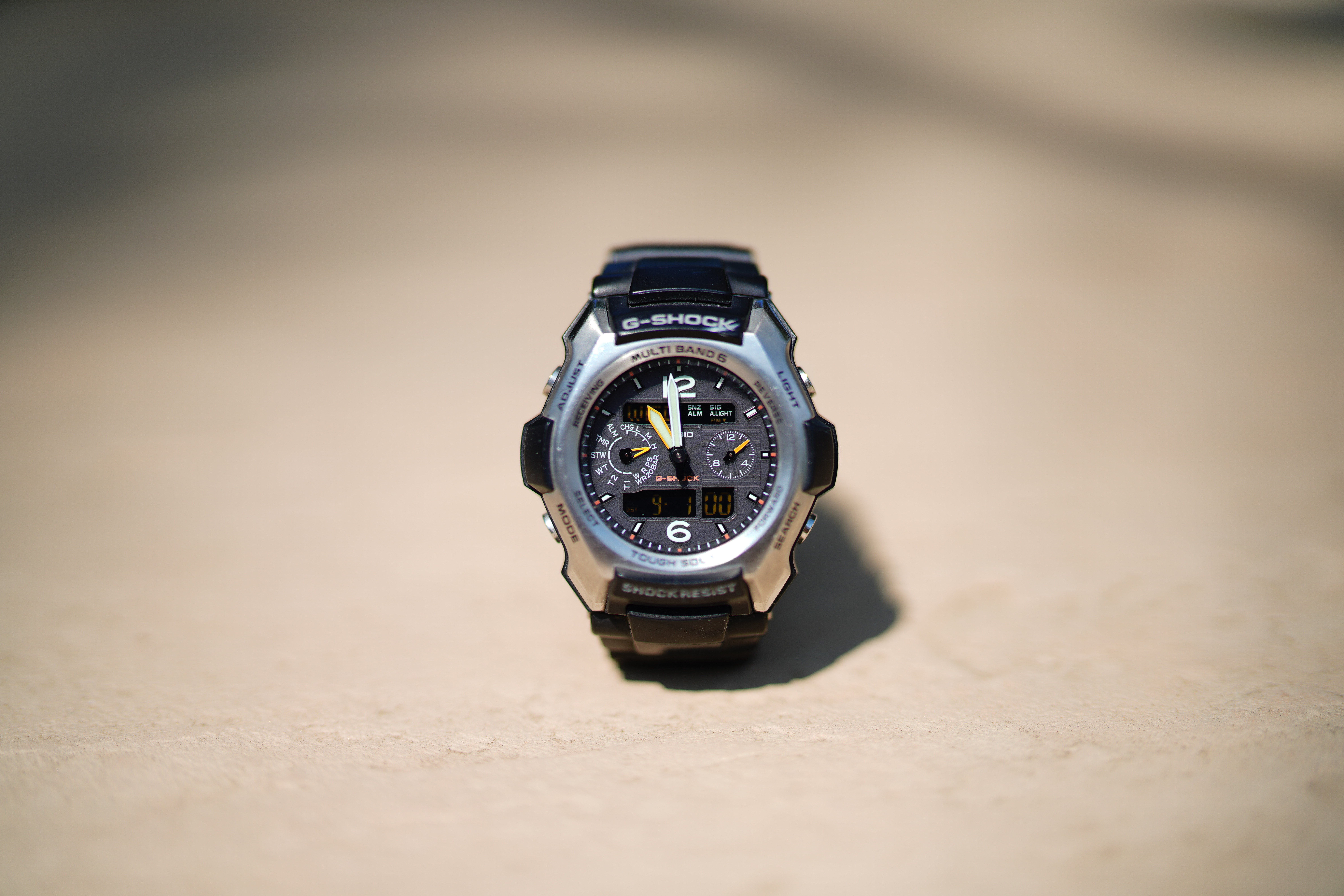 At f/8Casio G-Shock Solar Atomic Watch at close-focus distance, 01 September 2021. A7R IV, wide-open at f/1.2 at 1/5,000 at ISO 50, +0.7 stops exposure compensation (LV 13.8). bigger or camera-original © JPG file.