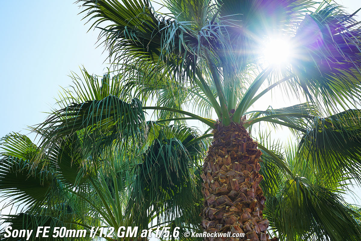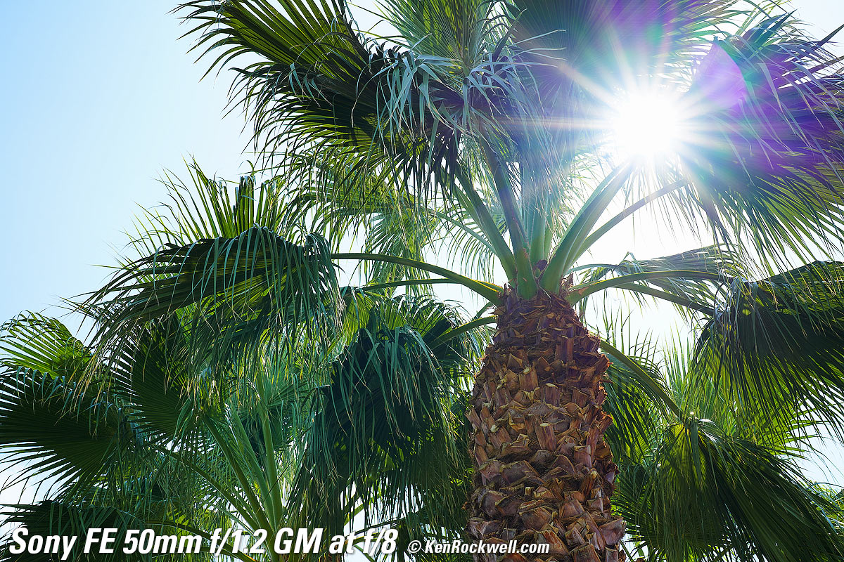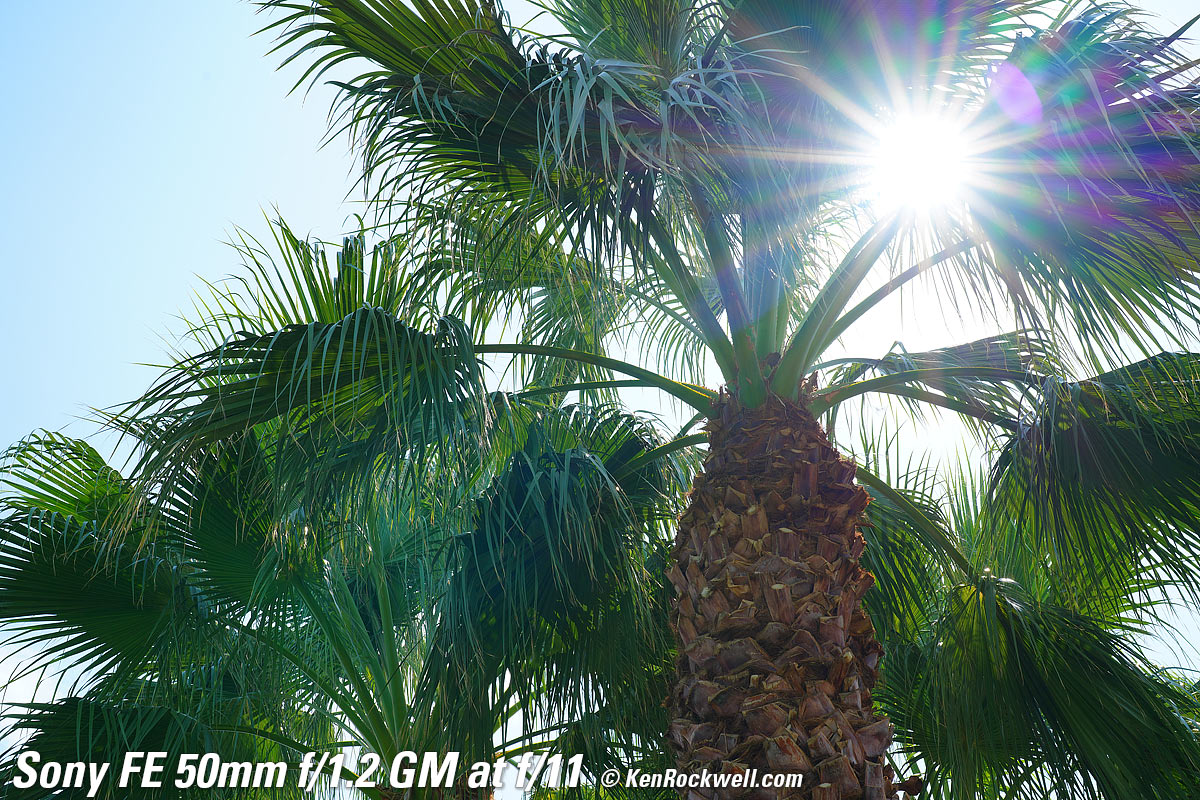 Sunstars performance topWith an 11-bladed rounded diaphragm, I get softer 22-pointed sunstars on brilliant points of light at about f/8 and smaller. Ignore the the slight vertical smear at large apertures, this is a sensor artifact called interline transfer smear and not a lens defect. Likewise ignore the crazy rainbow effect at small apertures; these are sensor artifacts caused by taking a picture directly of the sun and exposing for the dark underside of a huge palm tree, and using that same palm tree to hide the sky to accentuate the stars. Click any to enlarge:
