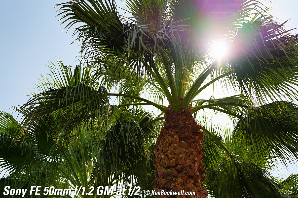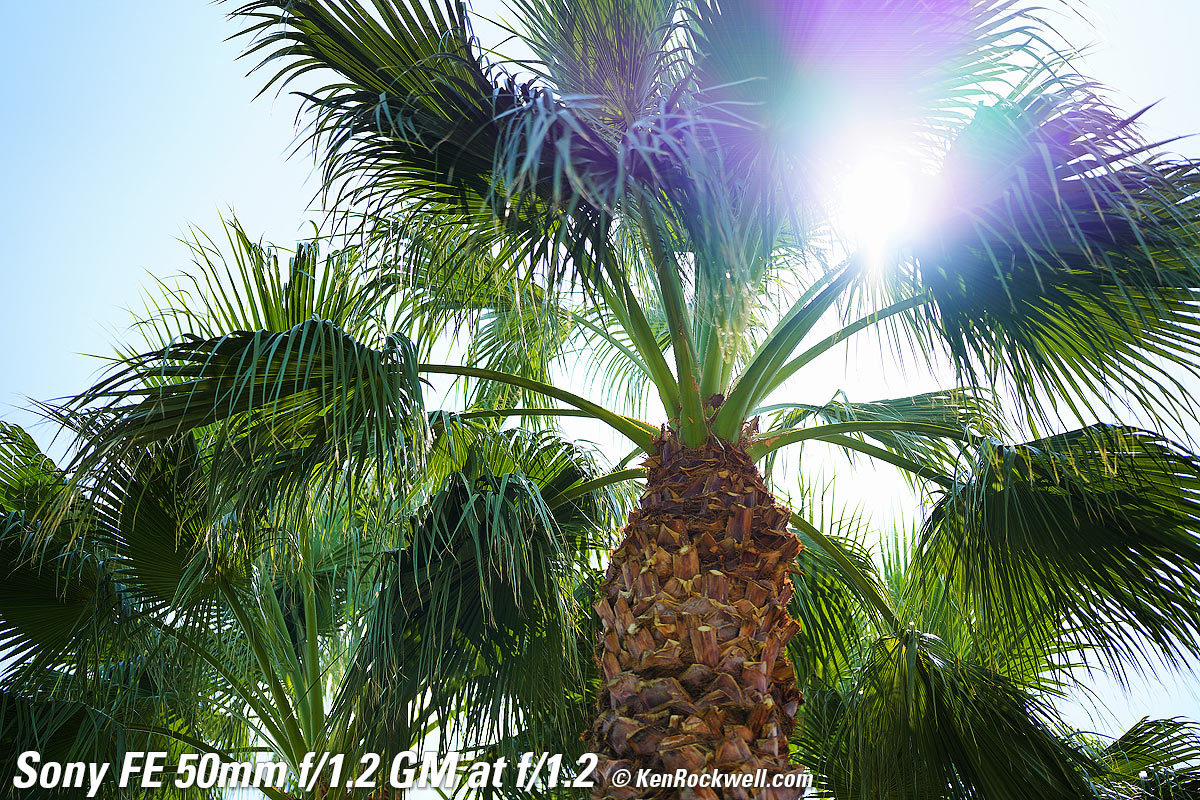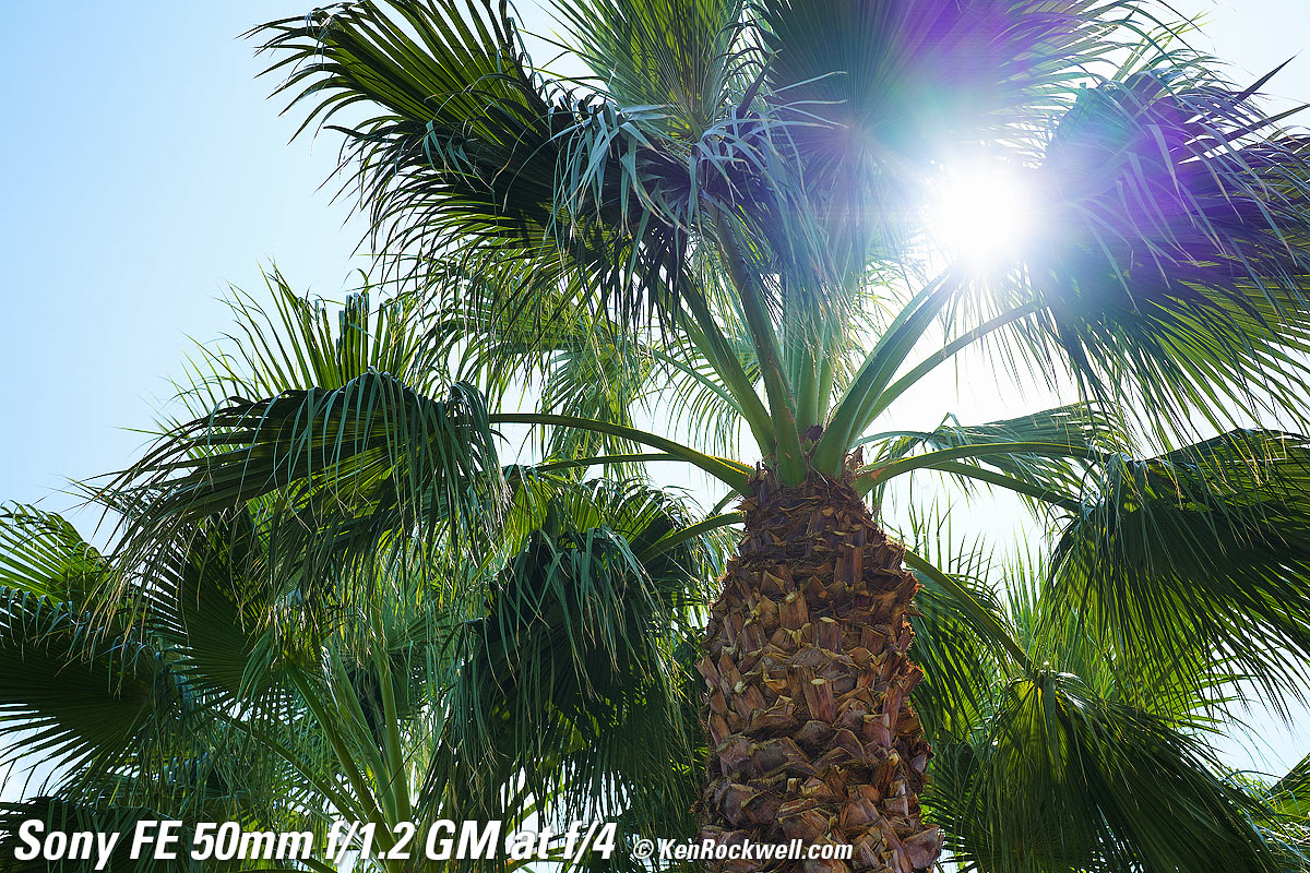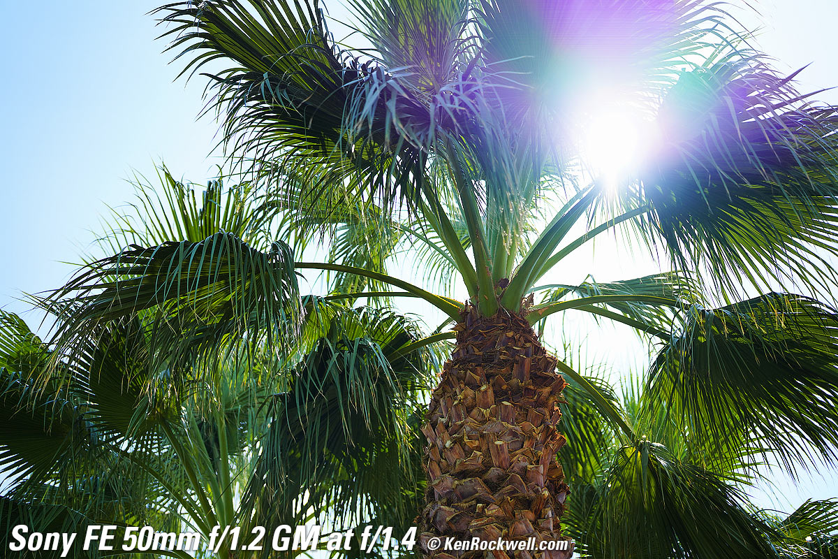 Sunstars performance topWith an 11-bladed rounded diaphragm, I get softer 22-pointed sunstars on brilliant points of light at about f/8 and smaller. Ignore the the slight vertical smear at large apertures, this is a sensor artifact called interline transfer smear and not a lens defect. Likewise ignore the crazy rainbow effect at small apertures; these are sensor artifacts caused by taking a picture directly of the sun and exposing for the dark underside of a huge palm tree, and using that same palm tree to hide the sky to accentuate the stars. Click any to enlarge: