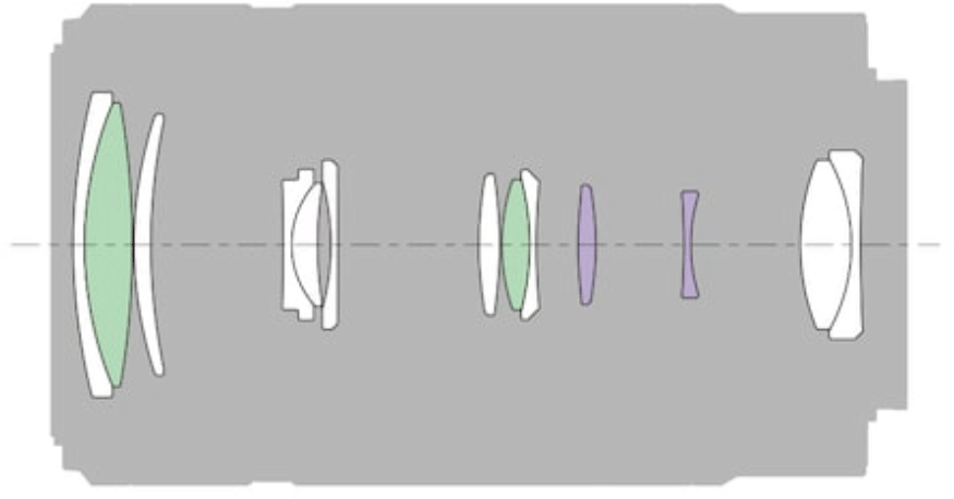 OpticsSony E 55-210mm internal optical construction. Aspherical and ED elements. 13 elements in 9 groups. Internal focus.