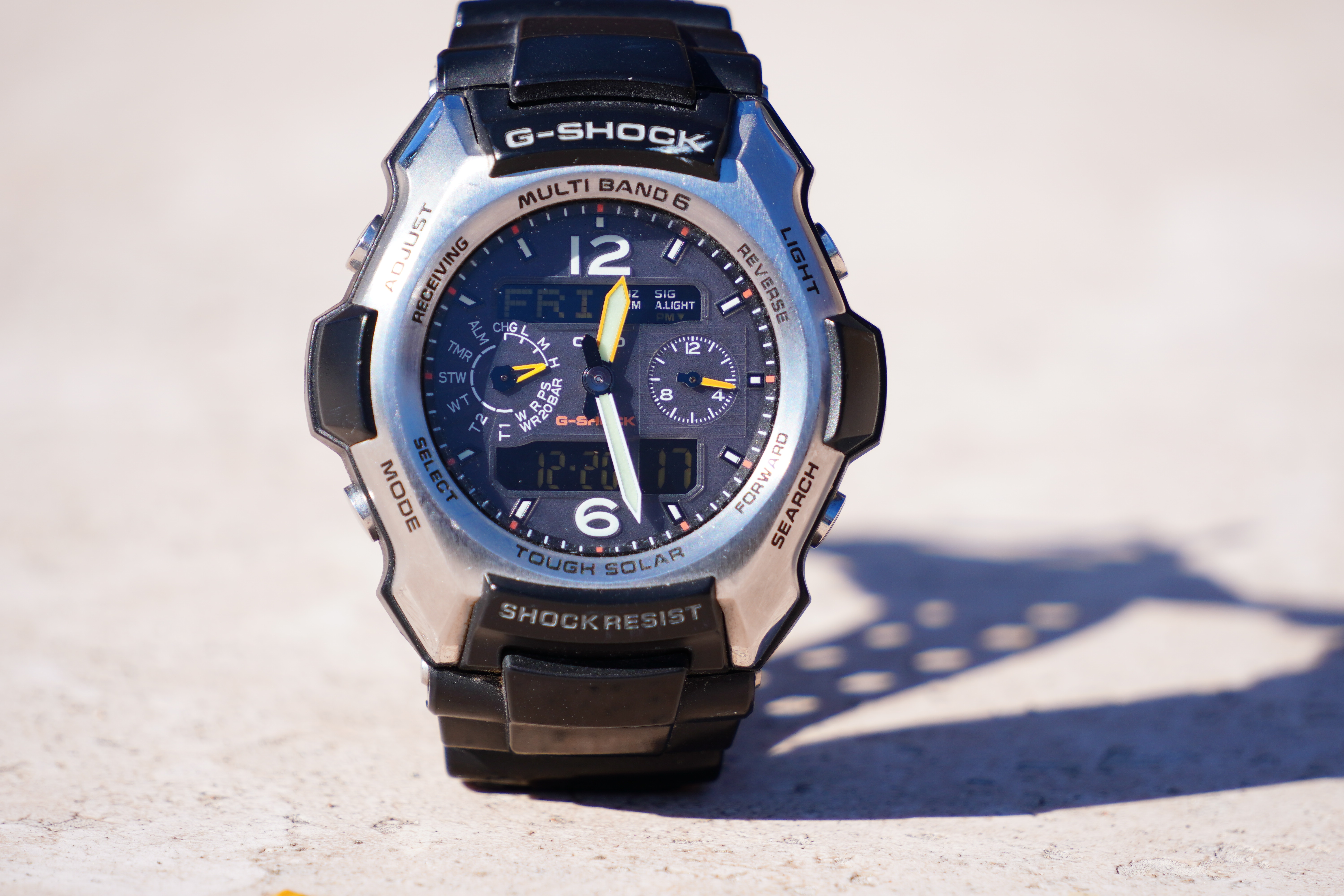Macro PerformanceIt gets very close, and it's also sharp wide-open at f/6.3: Casio G-Shock Solar Atomic Watch at close-focus distance at 210mm at f/6.3 on Sony A6600, 20 December 2019. bigger or camera-original © file.