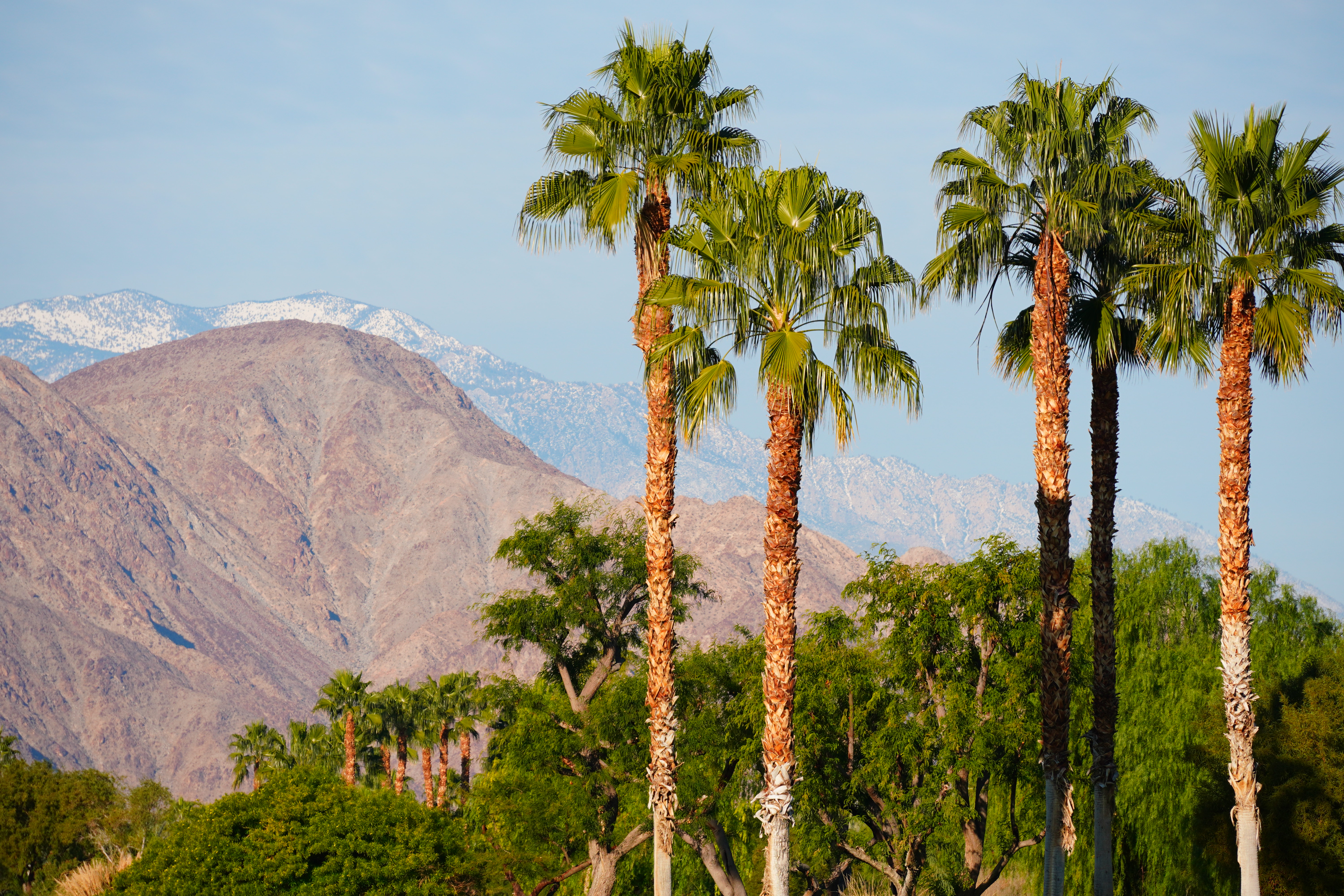 Desert Palms and Snow, 29 December 2019. Sony A6600, Sony E 55-210mm OSS at 165mm, f/7.1 at 1/400 at Auto ISO 100 (LV 14.3), exactly as shot. bigger or camera-original © file. Of course the mountains are 25 miles away and not in focus.
