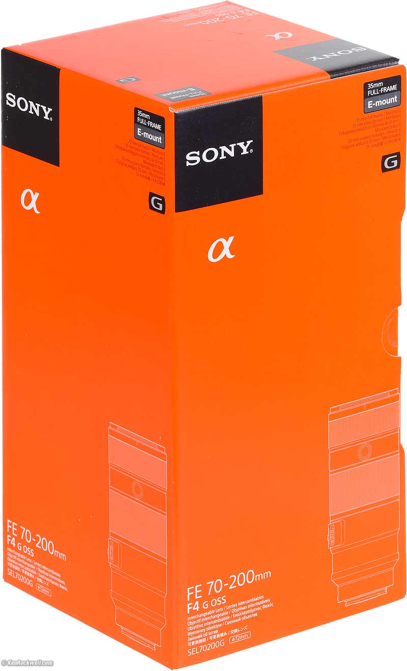 PackagingSony FE 70-200mm f/4 OSS GM. bigger. Package Weight: 3.1 lbs Corrugated box measures 10.4 x 5.4 x 5.3 inches. Lens in bubble wrap inside included vinyl sack.