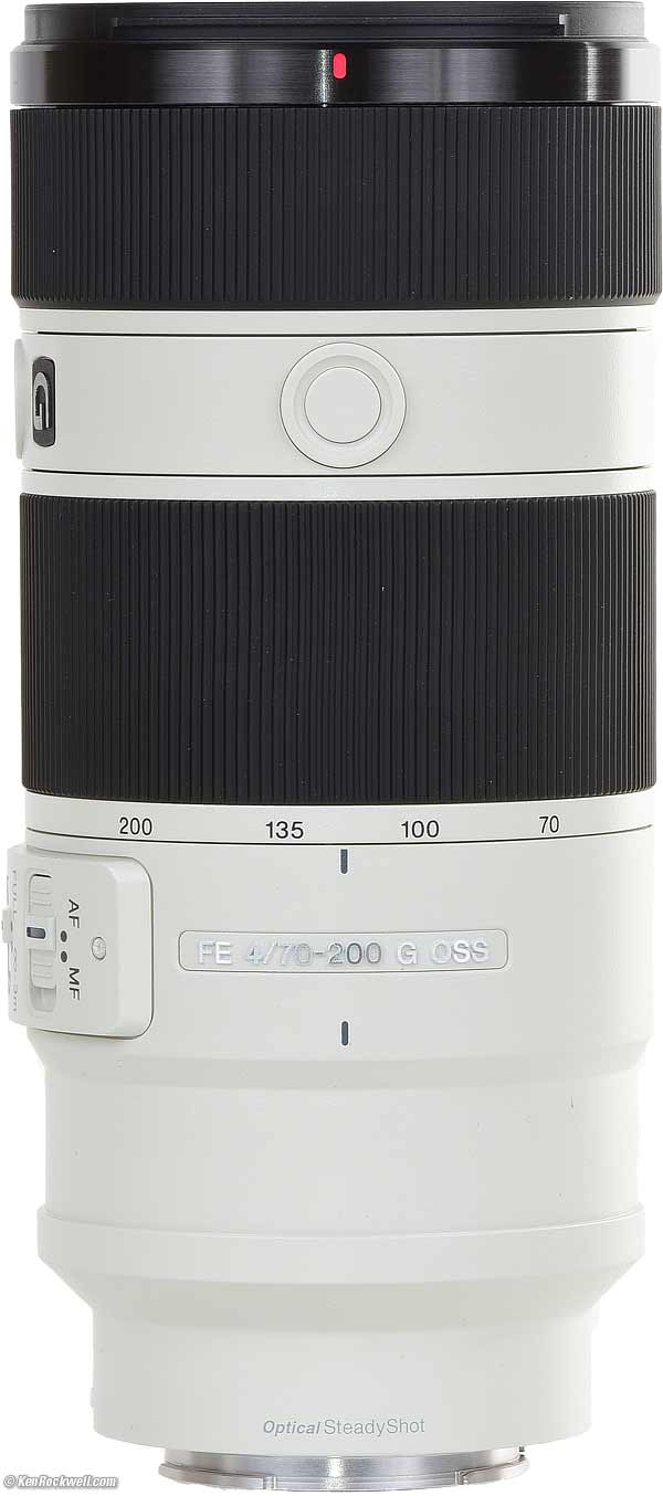 Sony 70-200mm f/4Full-Frame OSS FE GTop Sample Images Intro Format Compatibility Specs Performance Compared Usage Recommendations Sony: A9 III A1 II A1 A9 II A7R V A7R IV A7 V A7 IV A7 III A7S III A7CR A7C II A7c FX3 FX2 ZV-E1 A6700 A6600 A6400 ZV-E10 II ZV-E10 ZV-1 II RX1R III RX10/4 RX100/7 Flash Lenses Sony FE 70-200mm f/4 OSS G (72mm filters, 33.3 oz./944g with collar as shown (29.5 oz./838g without collar), 4'/1.2m close focus, $1,498). bigger. I got mine at B&H. I'd also get it at Crutchfield, or get it used if you know How to Win at eBay.