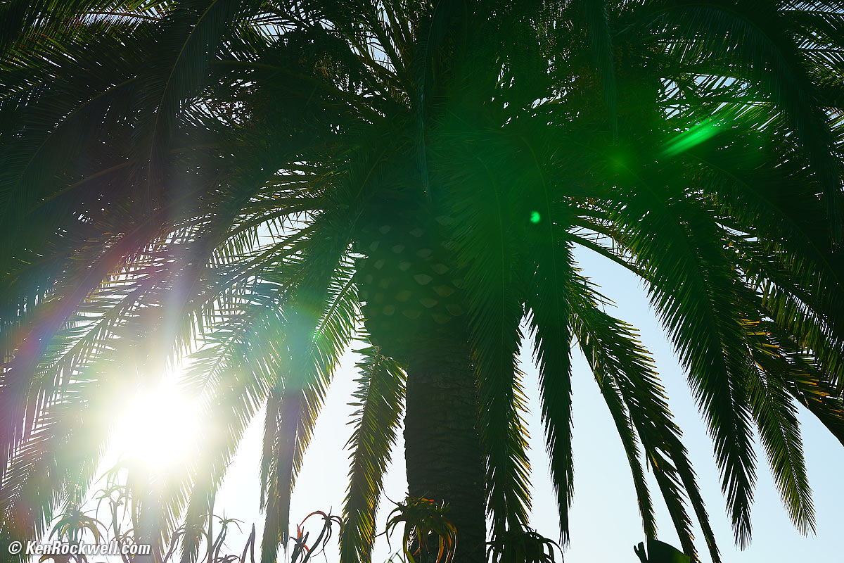 Flare & GhostsThere's more ghosting than I usually see, but it's nothing you're going to see unless you do something deliberately stupid as I've done here and put the direct disc of the sun in one corner and have a dark tree in the rest of the image against which to show any ghosts. You'll never see it in normal use; don't worry about it. Many people want ghosts, and even use software to add them back in to modern lenses like this! Palm Dawn, 09 February 2017. Sony A7II, Sony 24-70mm f/2.8 GM at 96mm at f/8 at 1/320 at Auto ISO 100. bigger.