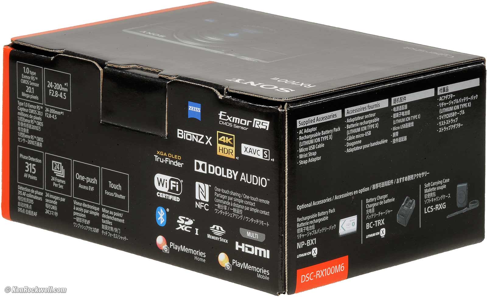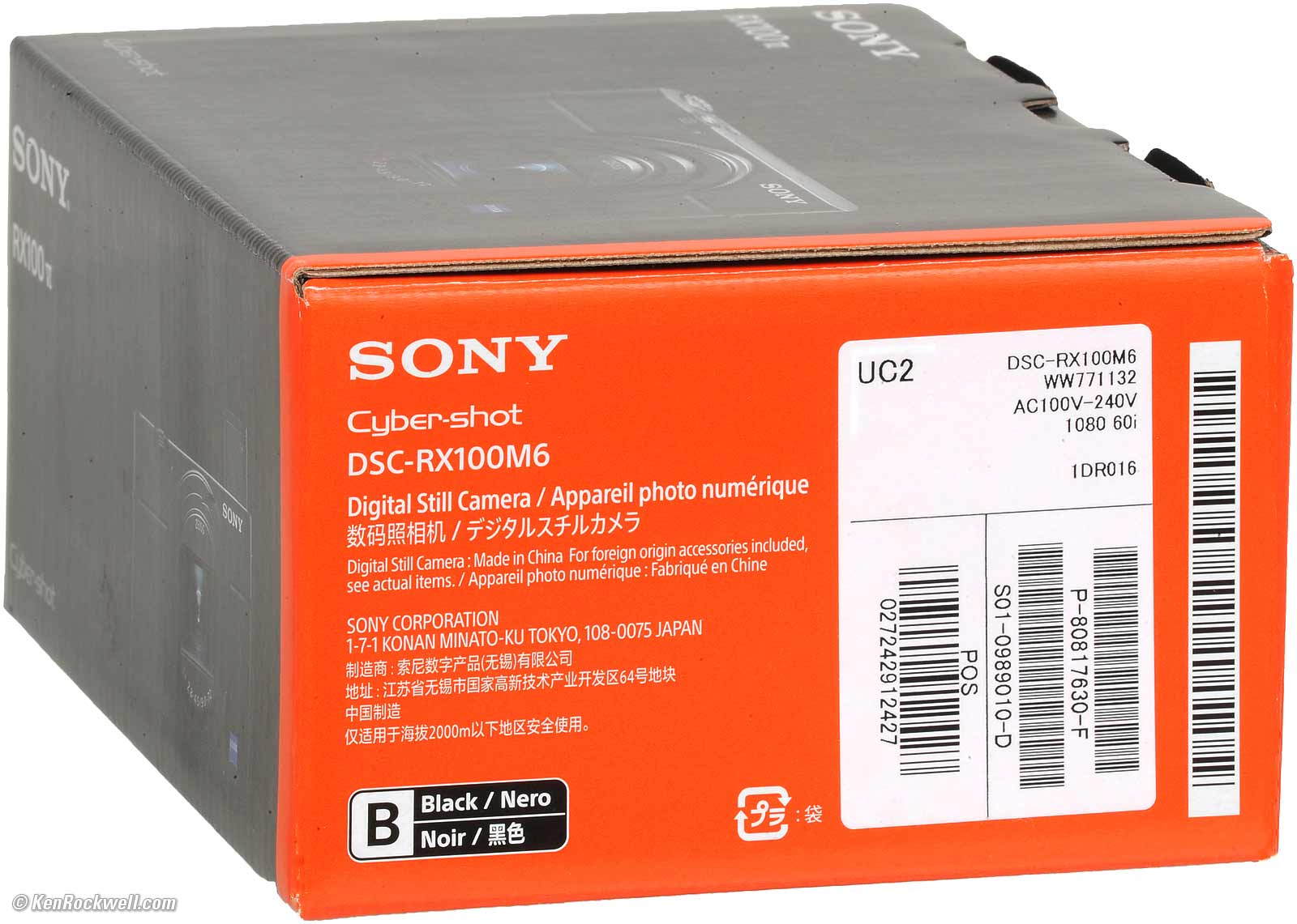 UnboxingTop Sample Images Intro Specs USA Version User's Guide Recommendations More The box is completely unsealed. There is no way to know if anyone else has been fiddling with your Mark VI, swapping parts and accessories, or even if it's a used camera. That's why it's critical only to buy from an approved online source, since they ship from automated warehouses where no shifty salesmen or customers ever get to touch your new camera before it ships. While new CDs, DVDs, Blu-Rays and bottles of milk and drinking water are sealed and quite obvious if anyone's opened them, paradoxically Sony doesn't bother sealing anything, so your only insurance is to buy only from a trusted online dealer. Box, Sony DSC-RX100 Mark VI. bigger.