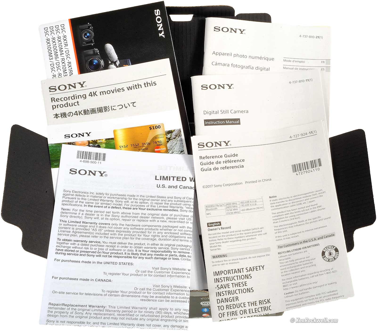 Box back, Sony DSC-RX100 Mark VI. bigger. Open the unsealed box and first you'll see the documentation lying on a folded cardboard tray. Here I've fanned it out so you can see what you get in the USA version: