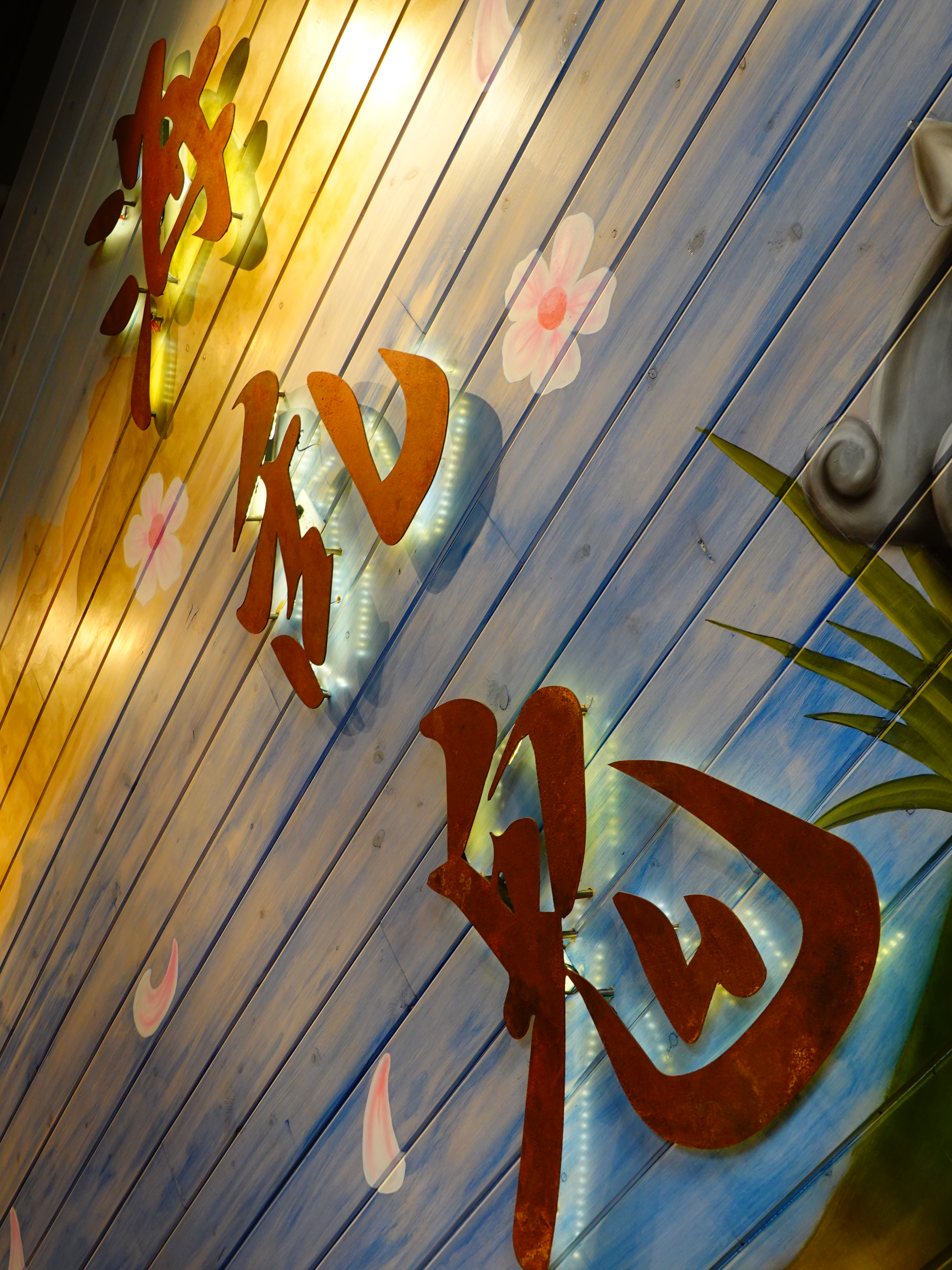 Japanese characters backlit against painted wood, 12 August 2018. Sony RX100 Mk VI at 41mm equivalent (14.7mm actual), wide-open at f/3.5 at 1/40 at Auto ISO 400, Perfectly Clear v3.5. bigger or camera-original file.