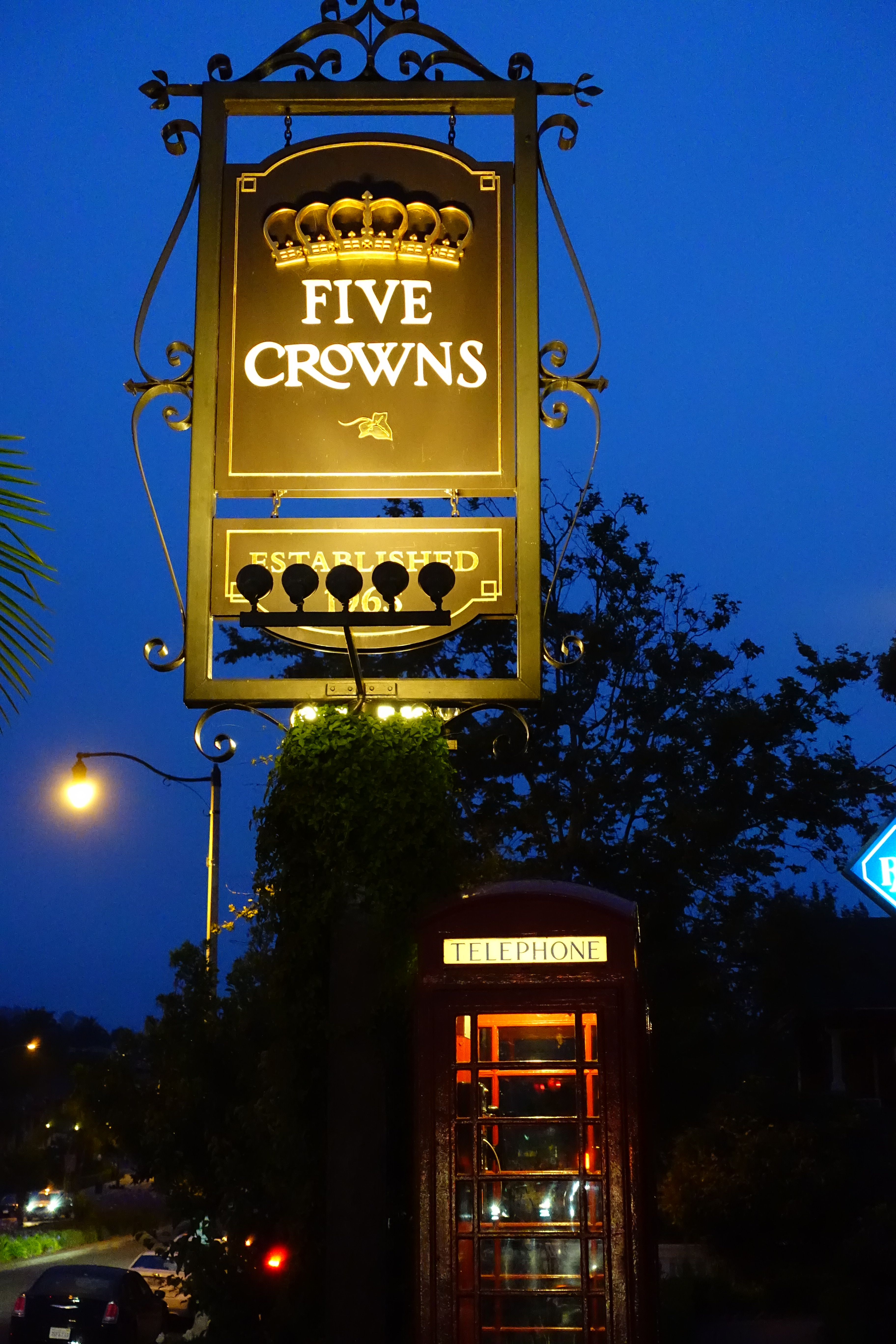 Five Crowns sign at night. (Sony RX100 Mk III at 19.3mm at f/2.8 at 1/60 hand-held at Auto ISO 3,200, no flash, Perfectly Clear V2.) bigger or camera-original © file.