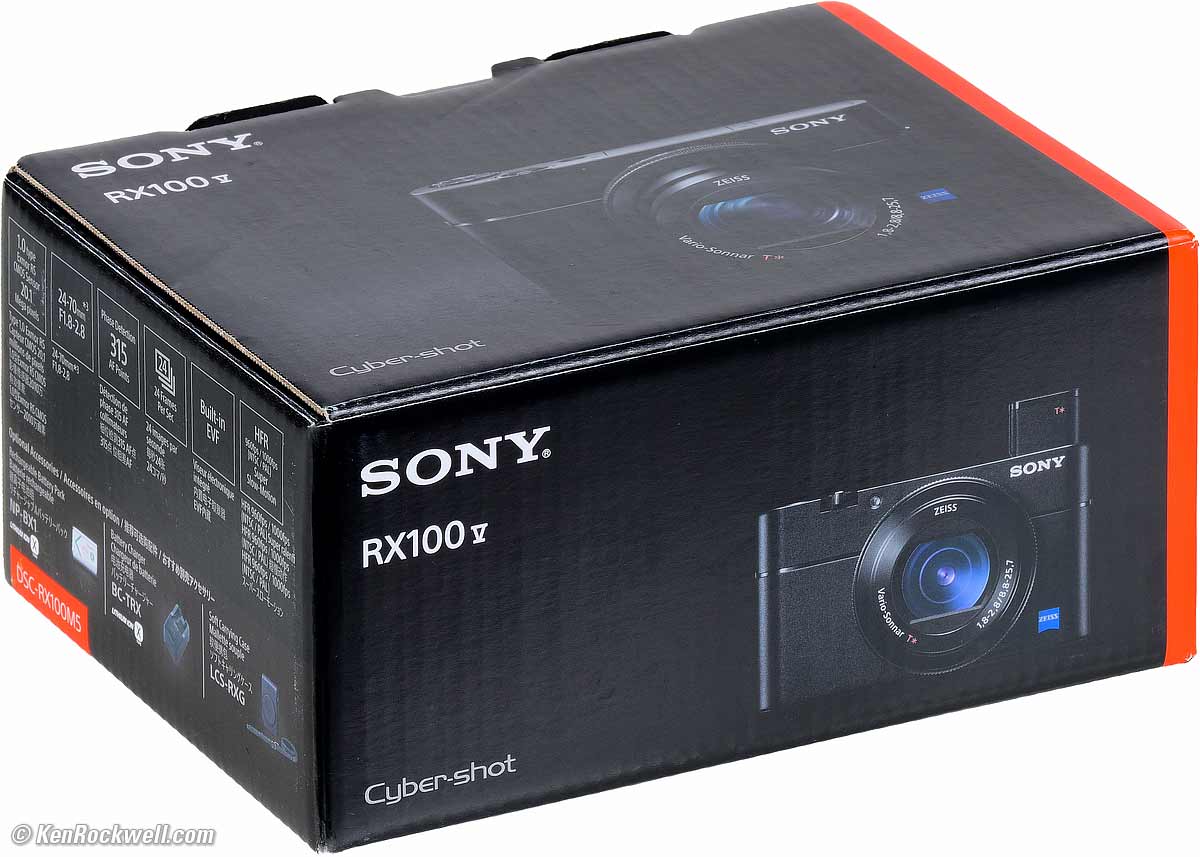 Sony RX100 Mk V24~70mm (eq.) f/1.8~2.824 FPS @ 20MP, 4K videoSample Image Files Intro Specs USA Version Performance Compared Usage Recommendations More Sony: A9 III A1 II A1 A9 II A7R V A7R IV A7 V A7 IV A7 III A7S III A7CR A7C II A7c FX3 FX2 ZV-E1 A6700 A6600 A6400 ZV-E10 II ZV-E10 ZV-1 II RX1R III RX10/4 RX100/7 Flash Lenses Sony Cyber-Shot DSC-RX100 Mark V (20 MP one inch sensor, 8.8-25.7mm f/1.8-2.8 lens (24-70mm eq.), 10.5 oz./298g with battery and card, get it used if you know How to Win at eBay or check at Amazon). bigger. This all-content, junk-free website's biggest source of support is when you use those or any of these links to approved sources when you get anything, regardless of the country in which you live. Sony doesn't seal its boxes in any way, so never buy at retail or any source not on my personally approved list since you'll have no way of knowing if you're missing accessories, getting a defective, store demo, damaged, returned or used camera. My approved sources ship from remote automated warehouses where no salespeople or lookie-loos can ever get their greasy fingers on your new Sony or drop it before you do. Buy only from the approved sources I use myself for the best prices, service, return policies and selection, and save yourself from a very expensive mistake. Thanks for helping me help you! Ken. Top, Sony DSC-RX100 Mark V. top.