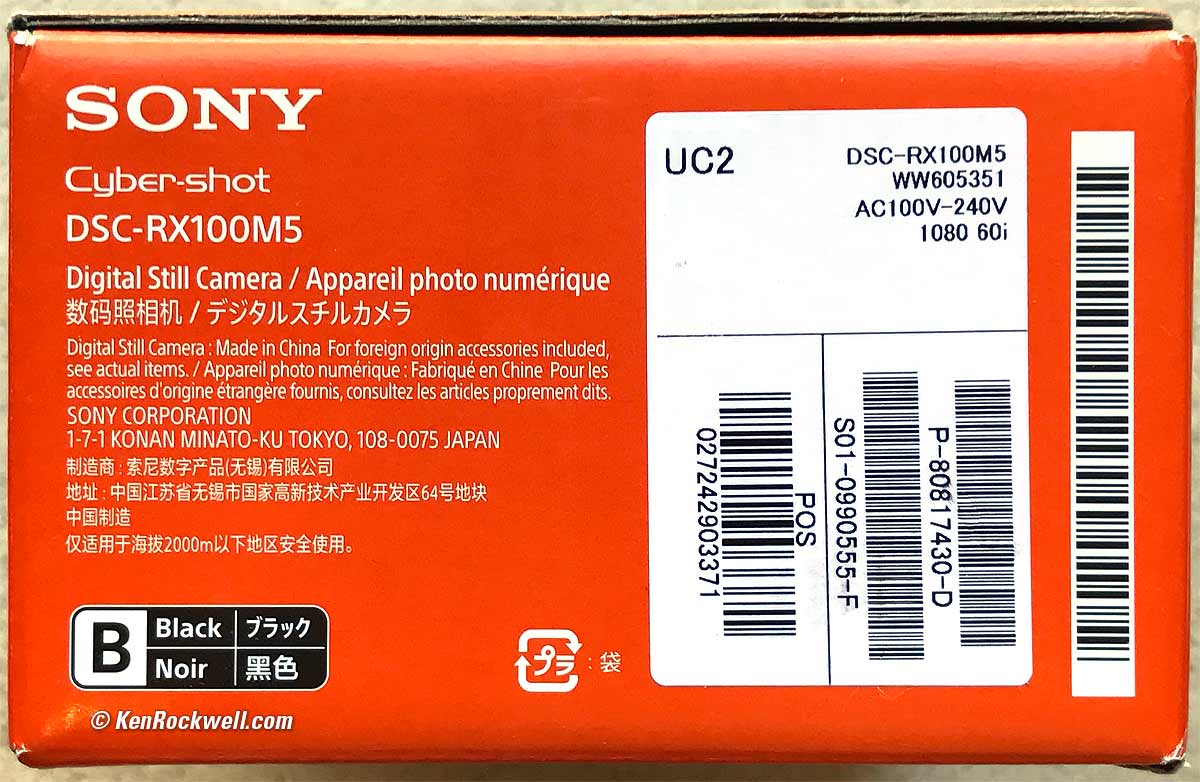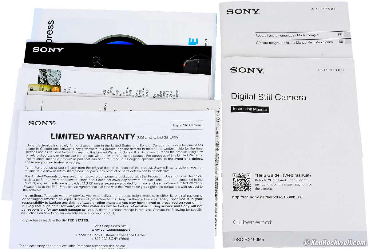 Getting a Legal USA Version(for USA only) Top Sample Image Files Intro Specs USA Version Performance Compared In the USA, be sure your box has a "UC2" shown near the bar codes: USA Sony RX100 V box end showing "UC2." bigger. If the letters are different, you got ripped off with a gray market version from another country. This is why I never buy anyplace other than from my personally approved sources. You just can't take the chance of buying elsewhere, especially at any retail store, because non-USA versions have no warranty in the USA, and you won't even be able to get firmware or service for it — even if you're willing to pay out-of-pocket for it when you need it! Always be sure to check your box while you can still return it, or just don't buy from unapproved sources, so you'll be able to have your camera serviced and get free updated firmware as needed. The legal USA version also has a limited warranty card from Sony USA, which specifically mentions purchases made in the UNITED STATES: USA Sony RX100 V warranty card. bigger. If there's a question, you can call the number on the card to confirm your serial number, or just get yours from the same places I do so you don't need to worry. The USA version includes one printed English manual, shown on the right, and a second Spanish and French manual also shown on the right.