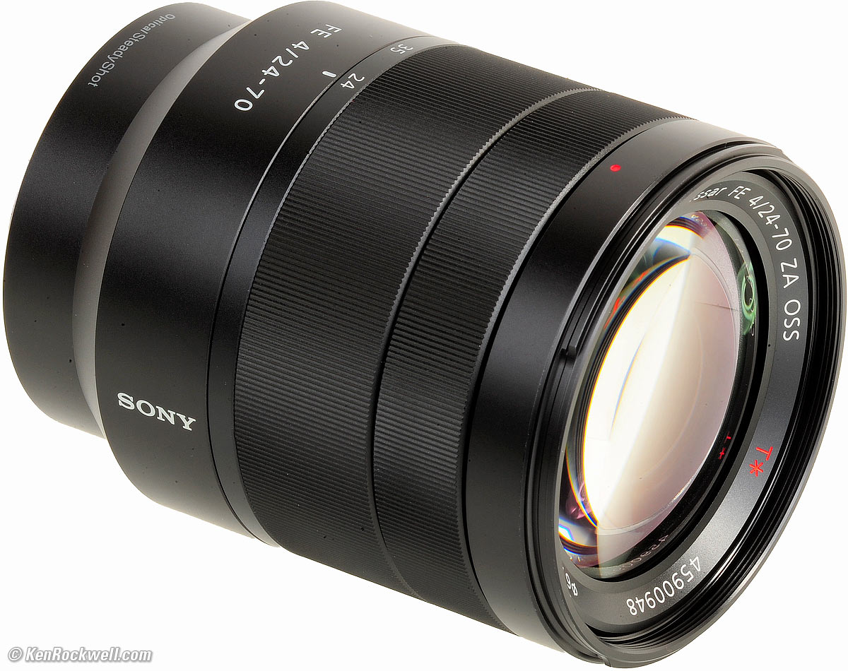 Name top Sony calls this the Carl Zeiss Vario-Tessar FE 4/24-70 ZA OSS T*. Carl Zeiss: Name of a German lens design company. Vario-: a zoom lens. Tessar: Zeiss' trademarked brand name for a four-element normal lens designed back in 1902. It still sounds cool, so Zeiss uses it today for other things, like this lens that have nothing to do with a 1902 Tessar. FE: Full-frame coverage lens for Sony E mount. ZA: Solidarity with South Africa. FE: Full-frame coverage lens for Sony E mount. OSS: Sony's trademark for its Image Stabilization: "Optical Steady Shot." T*: Zeiss' trademark for its multi coating.