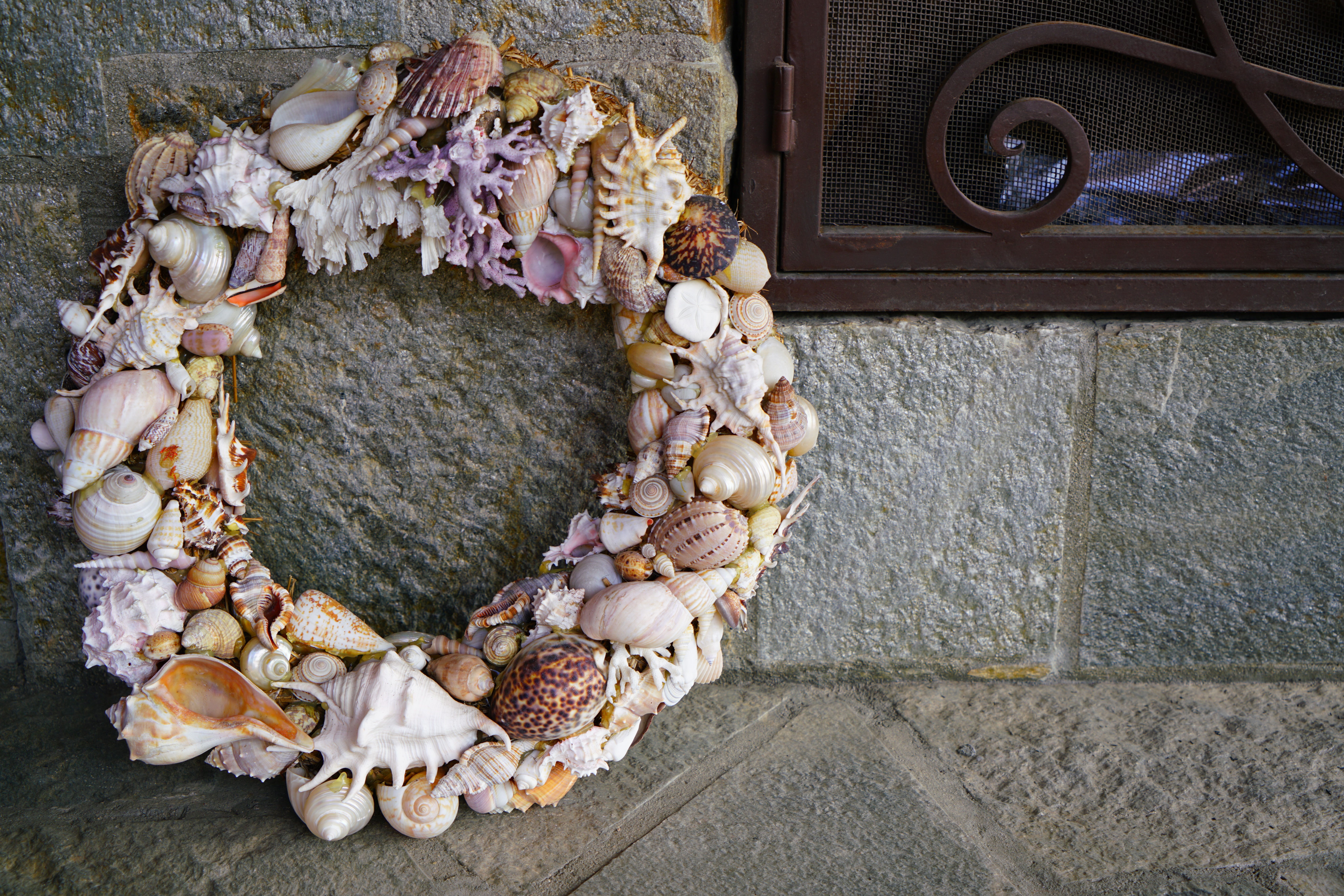 Shell Wreath, 11 September 2015. Sony A7R II, Zeiss FE 24-70mm f/4 at 46mm, f/5 at 1/100 at Auto ISO 100. Camera-original © JPG file. Only some of the wreath is actually in focus; the slate is not.