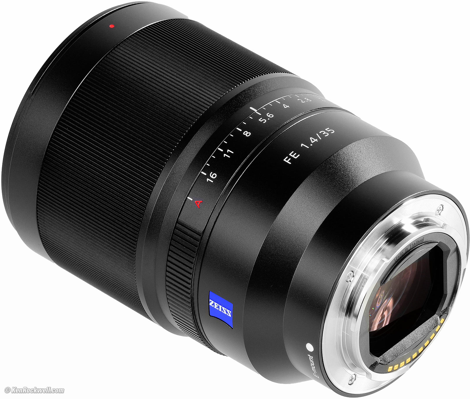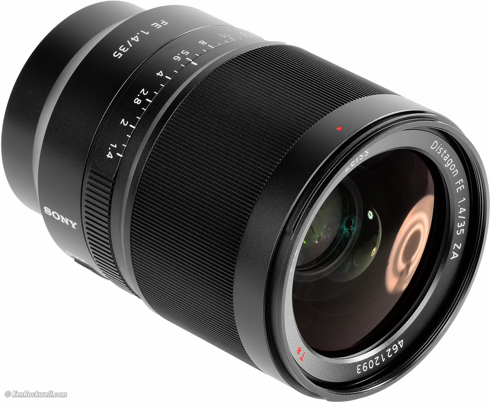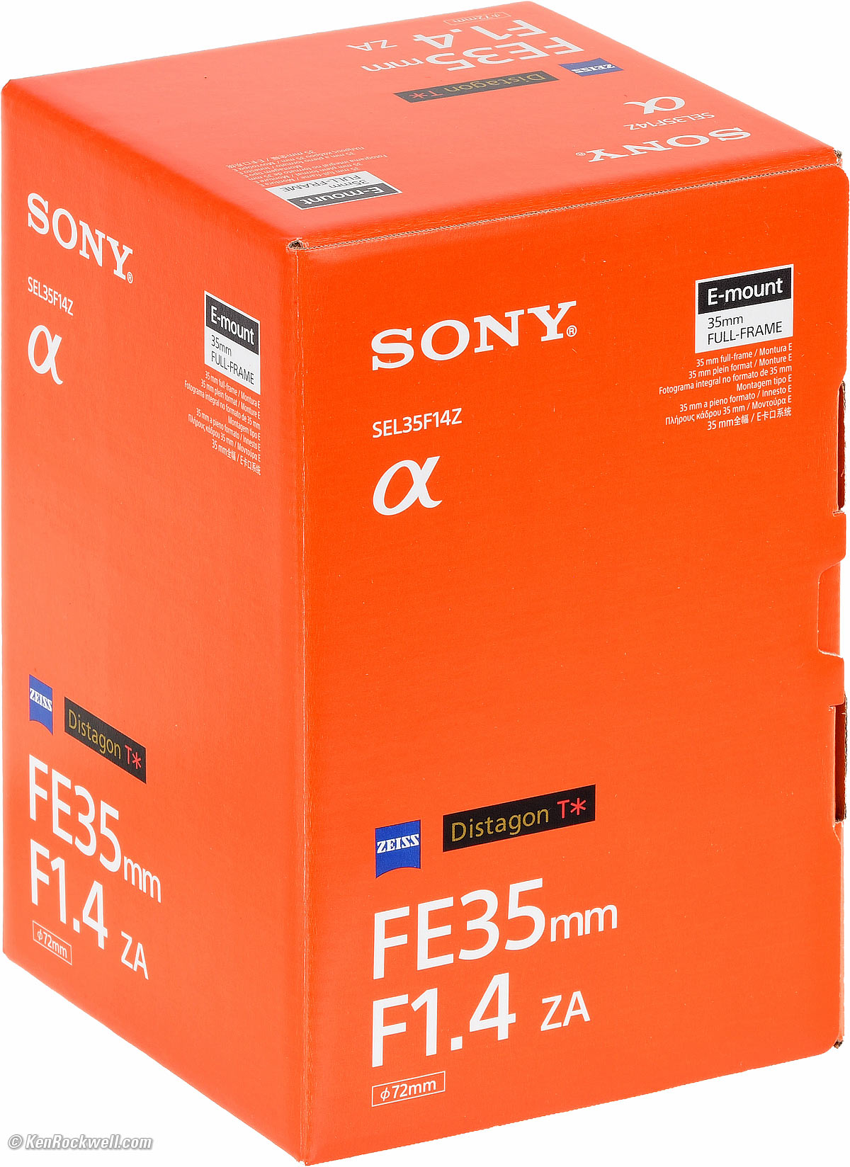 NameSony calls this the Zeiss Distagon T✻ FE 1,4/35 ZA. Zeiss: Brand name of famous German lens company. (Lens is actually made by Sony under license in Thailand; it's not made by Zeiss.) Distagon: Zeiss' trade name for wide-angle retrofocus lenses. FE: Full frame coverage lens for Sony's NEX cameras. ZA: Solidarity with South Africa. T✻: Zeiss' trademark for multicoating, standard on all camera lenses of all brands since the 1970s. Sony Part Number: SEL35F14Z.