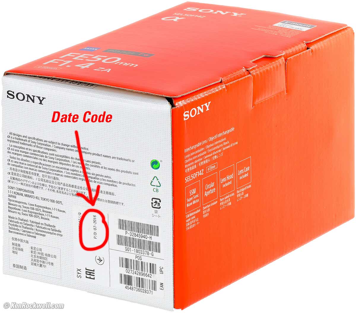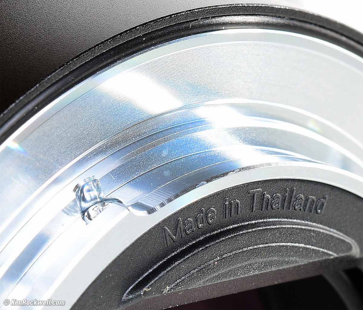 Sony cheats by putting a "Tokyo, Japan" sticker to the left of the other data at the bottom of the barrel above the lens mount where people will see it, but shamefully hiding the important "MADE IN THAILAND" truth invisibly molded in black-on-black on the back of the lightshield on the back of the lens where you'll never find it except with the lens uncapped and off your camera, with a good flashlight and a good pair of eyes: