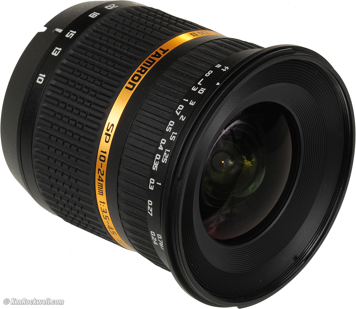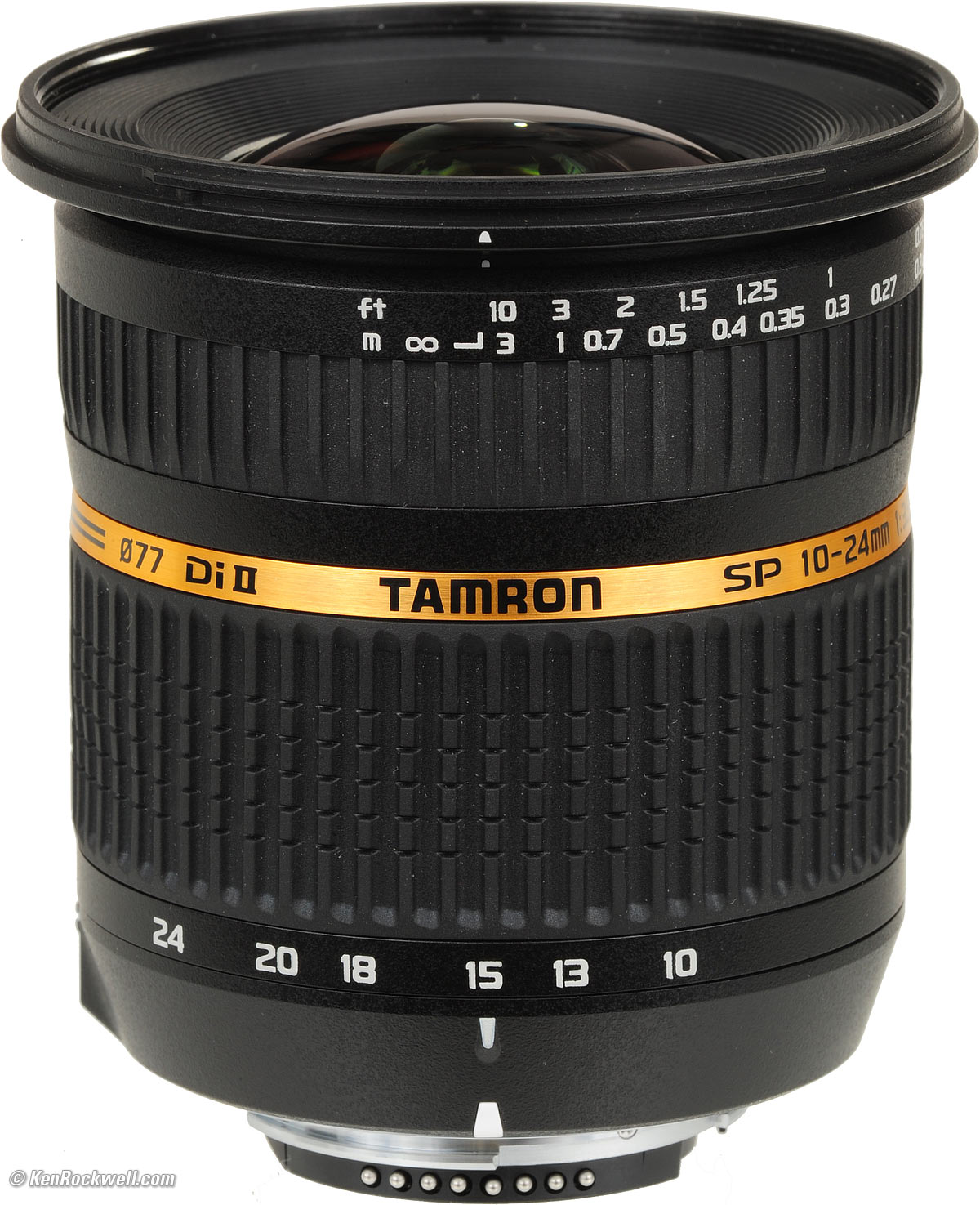 Specifications with commentary top Intro Specifications Performance Recommendations Name: Tamron's marketing calls this the Tamron SP AF 10-24mm f/3.5-4.5 DiII LD Aspherical (IF), model number B001NII. The letters are meaningless marketing crud designed to make you think you're getting something different than every other lens. Don't fret these; this Tamron is optically the softest ultrawide I've used on digital cameras. Optics: 12 elements in 9 groups. Internal focusing. Coverage: Small-format digital only, no film or full-frame. Focal Length: 10-24mm, which on a DX camera gives angles of view similar to what a 15-35mm lens gives when used on an FX or 35mm camera. Used on a Canon 1.6x camera, it covers angles of view similar to what a 16-39mm lens would see. Close Focus: 9 ½" (0.24m) from the image sensor, which means just inches (centimeters) from the front of the lens. Maximum Reproduction Ratio: 1:5.1. Hard Infinity Focus Stop? No. Focus Scale: Yes. Depth-of-Field Scale: No. Infra-Red Focus Index: No way, José. Diaphragm: 7 straight blades. Stops down to f/22 at 10mm to f/29 at 24mm. Aperture Ring: None. Filter Thread: 77mm, plastic. Does not rotate. Size: Tamron specifies 3.4" (86.5mm) extension from flange by 3.3" (83.2mm) diameter. Weight: 15.020 oz. (425.8g), measured, in Nikon mount. Tamron specifies 13.1 oz. (370g), which is much different. Hood: AB001N plastic bayonet, included. Made in: Red China. Hood is marked "Japan." Introduced: 2008. Available: Since late 2008. Tamron Model Number: B001NII. Packaging: Silver-ink single-wall box, corrugated inserts. Price: $500, USA, January 2009.