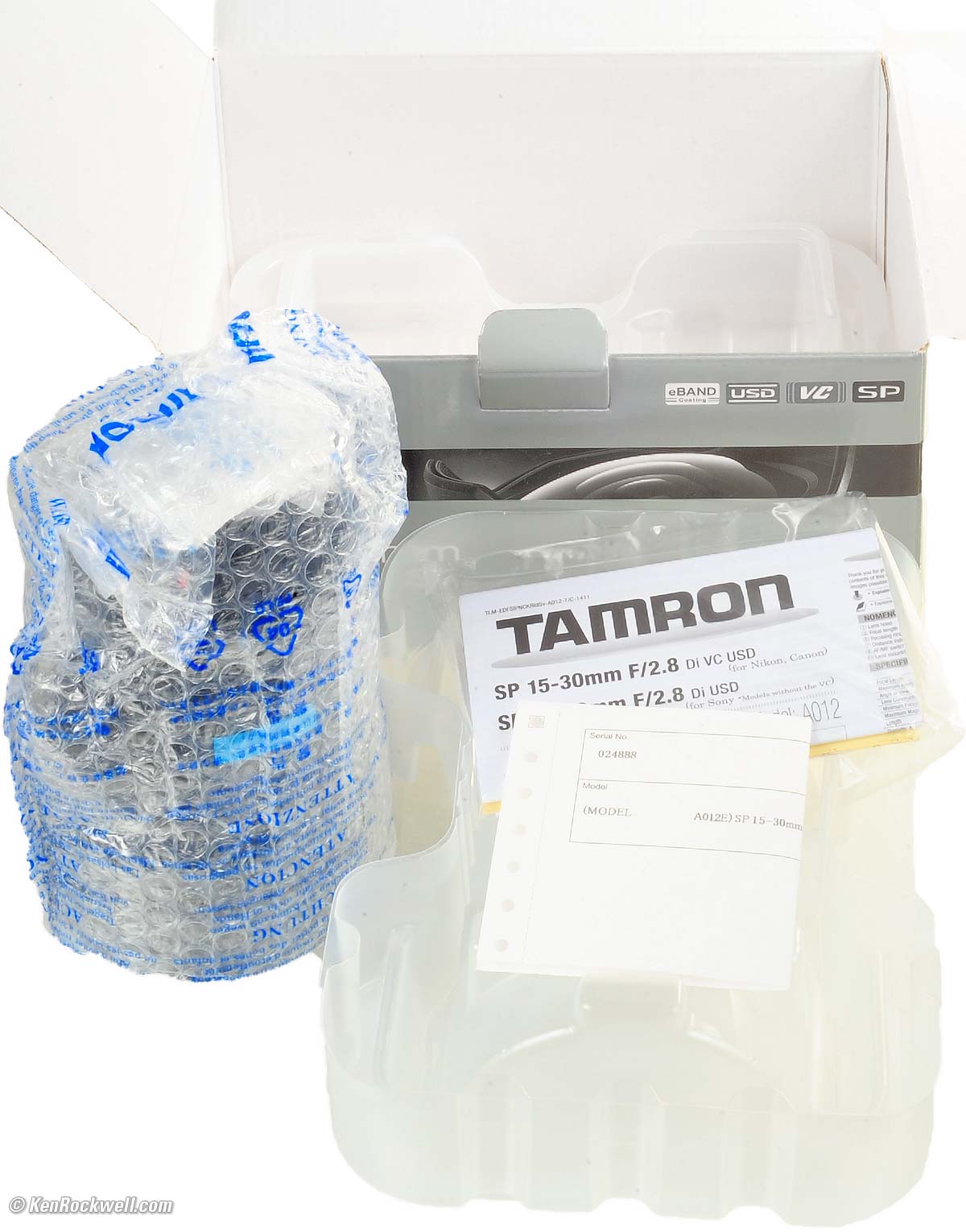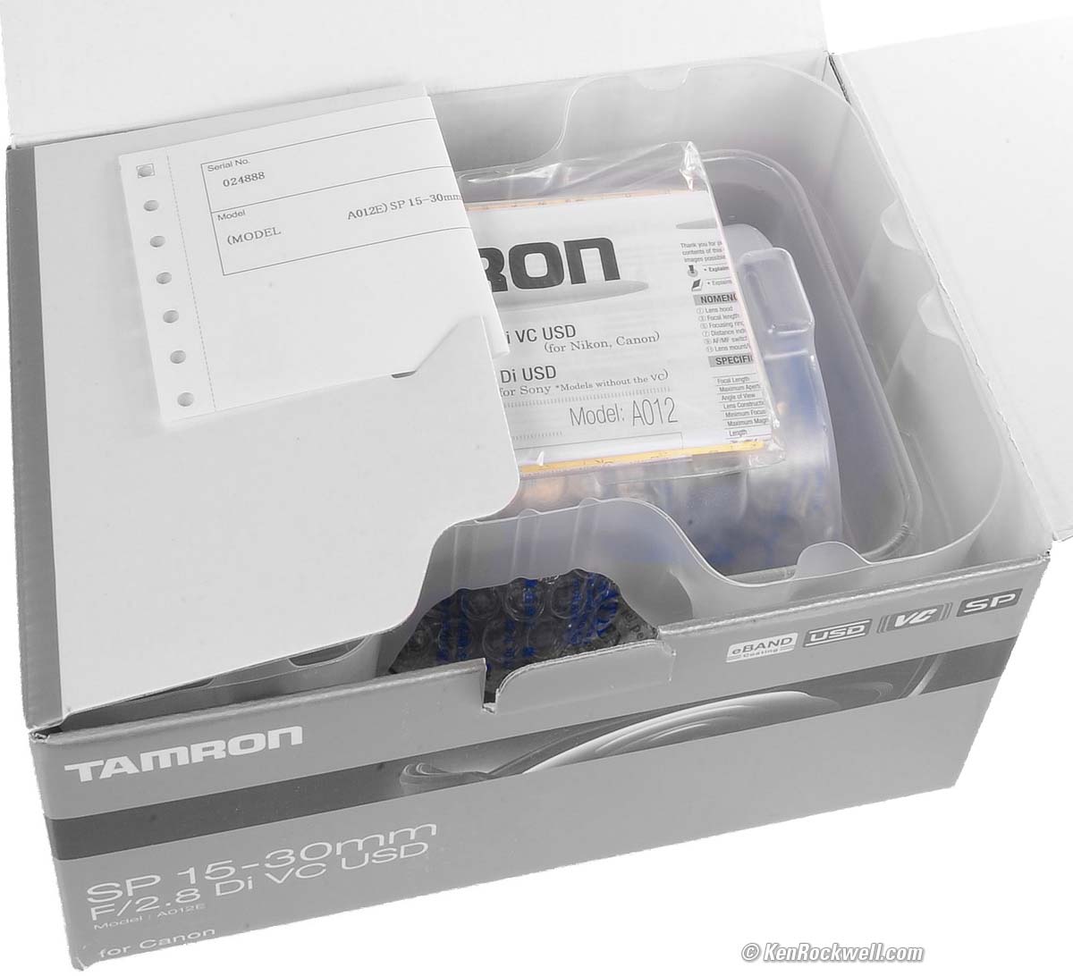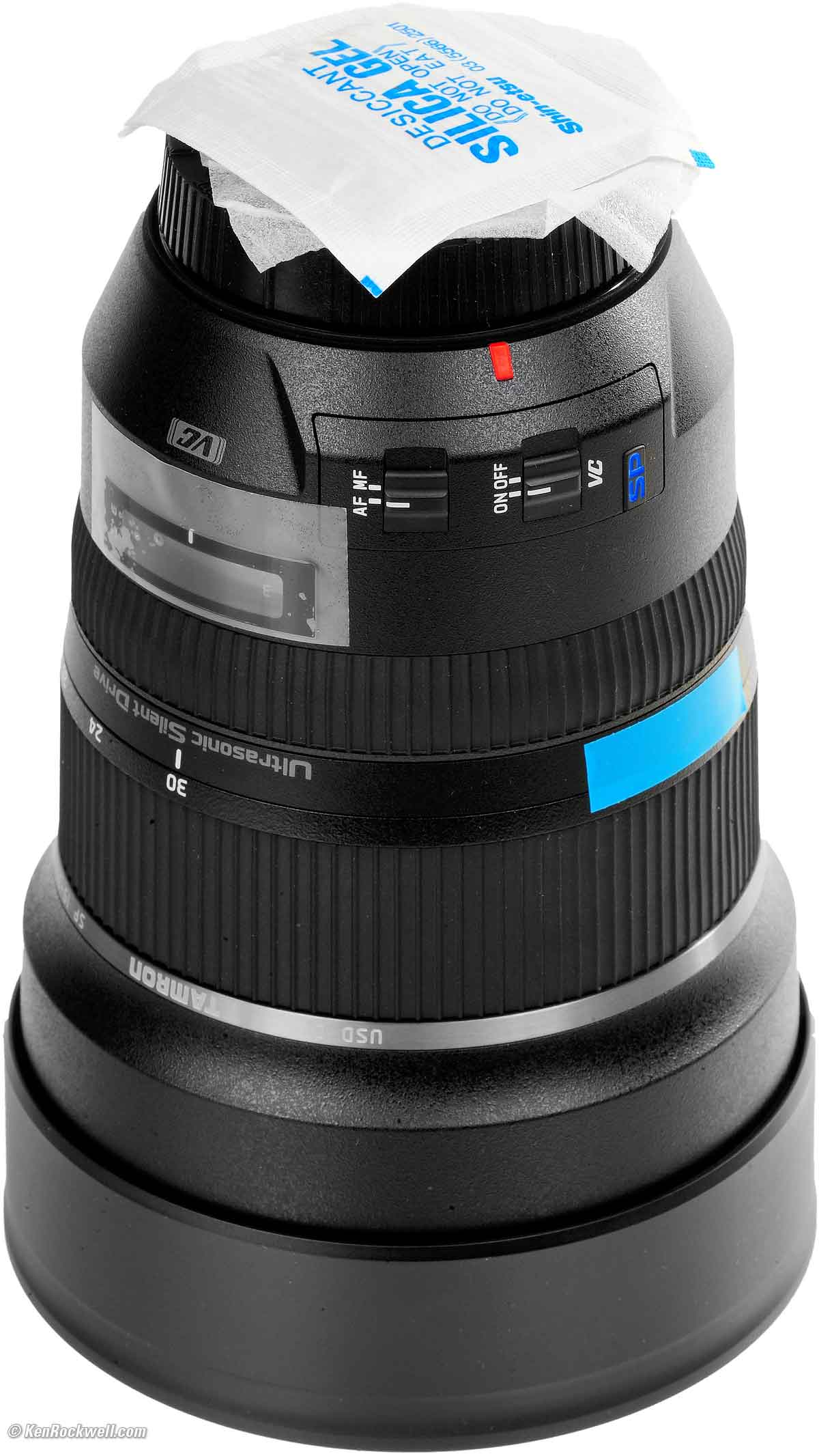 UnboxingTop Sample Images Intro Format Compatibility Specs USA Version The box is a common micro-corrugated box: Tamron 15-30mm f/2.8. bigger. The box is completely unsealed. There is no way to know if anyone else has been fiddling with your lens, swapping parts and accessories, or even if it's a used lens. This is why it's critical only to buy from an approved online source, since they ship from automated warehouses where no shifty salesmen or customers ever get to touch your new camera before it ships. While new $5 CDs, DVDs, Blu-Rays and bottles of milk and drinking water are sealed and quite obvious if anyone's opened them, paradoxically Tamron doesn't bother sealing anything, so your only insurance is to buy only from a trusted online dealer. Open the top flap and you should see the bare serial number slip carefully tucked into a slot in the left flap. If it's just sitting on top of the other paperwork, that suggests someone's been in there before. Tamron 15-30mm f/2.8. bigger. Inside the box are the instructions in a plastic bag and two molded clear plastic sections that hold the lens. The lens is wrapped in bubble-wrap with TAMRON printed on it. Tamron 15-30mm f/2.8. bigger. Take your new lens out of the bubble wrap and you'll see that it has protective plastic covering the clear distance window, there are sheets of protective soft white paper at the rear cap, and a silica gel pack thrown in. The interesting part is that Tamron uses two pieces of blue tape on each side of the lens to keep the zoom ring set to 30mm in shipping: New, Unused Tamron 15-30mm f/2.8. bigger.