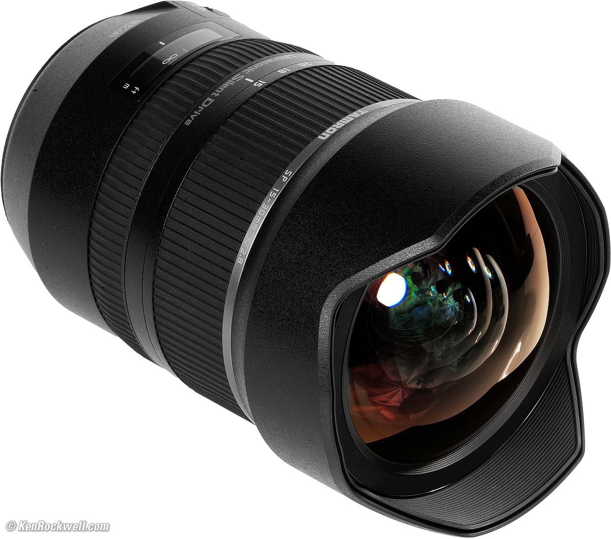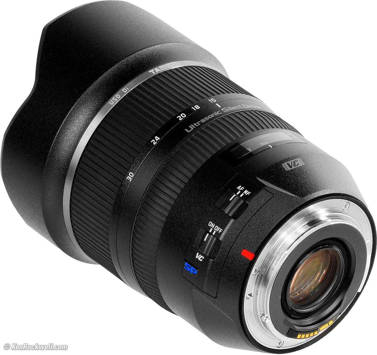 ErgonomicsTamron 15-30mm f/2.8. bigger. This Tamron is the same as the Nikon 14-24mm or Canon 11-24mm f/4 L. These are all big, fat, heavy lenses with no front element protection other then the built-in petals, and no ability to use a front filter for protection. All weigh about the same and all have big, fat front elements. This image isn't conveying how big it is until you look at the little lens mount. See how, unlike most lenses, the barrel greatly expands as it gets away from the mount? This lens is about 33% bigger in every dimension than a typical zoom. If it took screw-in filters (which it doesn't), they would be 95mm, not 77mm like most large pro DSLR lenses. Zoom and focus are as expected. The big zoom ring needs two fingers to work well; you're moving a lot of glass. The focus ring needs just one slightly firm finger to slide it, no need for two fingers. You can feel the big red mounting index with your eyes closed. Excellent! This Tamron has its feet and meter distance scales both in the same tiny gray digits. They aren't easy to read, and meters and feet look the same, not bright yellow or green as on Nikon or Canon. Also the Tamron puts the AF/MF slide switch much higher on the lens so my thumb doesn't directly reach it, which is different from Nikon or Canon. When you reach for what you expect to be the AF/MF switch, instead you reach the VR/IS ON/OFF switch.