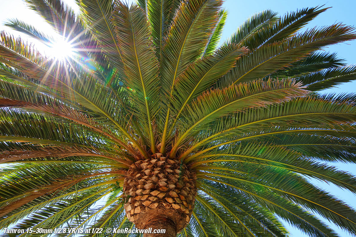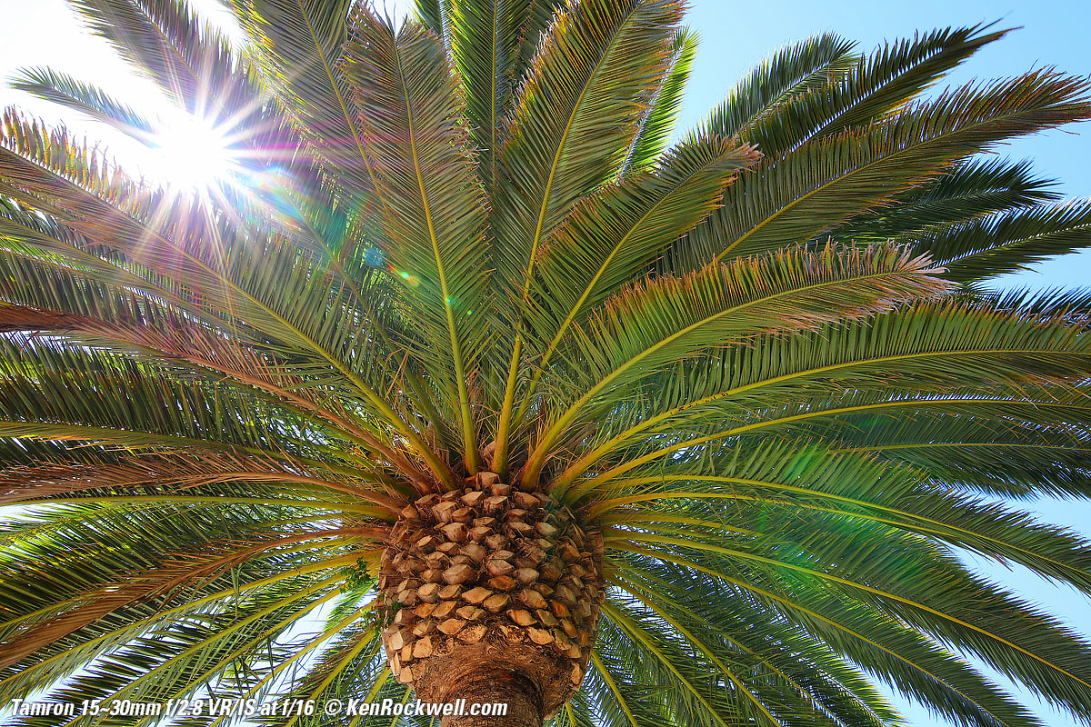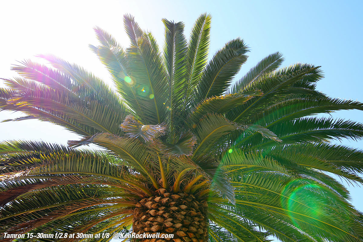 Flare & GhostsThis lens is less resistant to ghosting than other lenses, but I doubt you'll see any unless you go out of your way as I did here, with the sun shining directly into my lens and then exposing for the dark shadows of the palm tree. See more reasonable examples at Sunstars. Worse case flare at f/8 and 30mm. bigger.