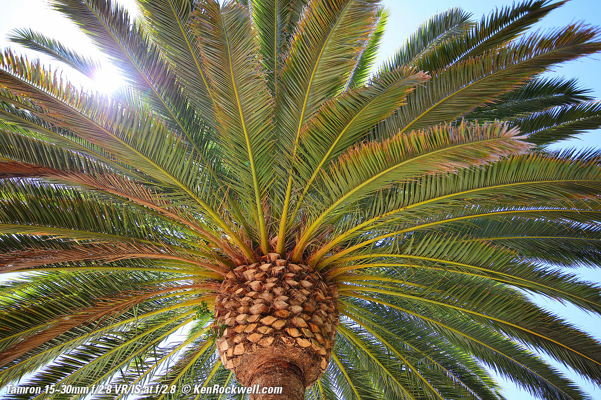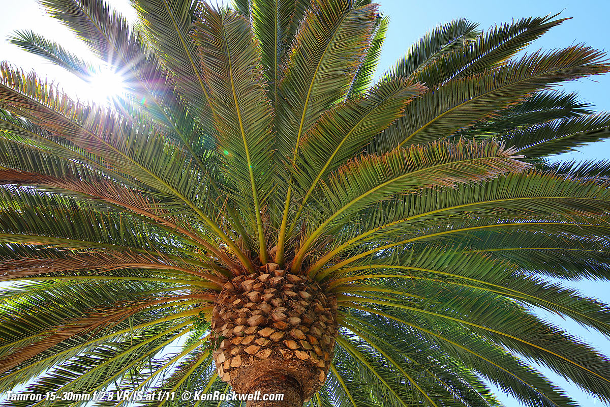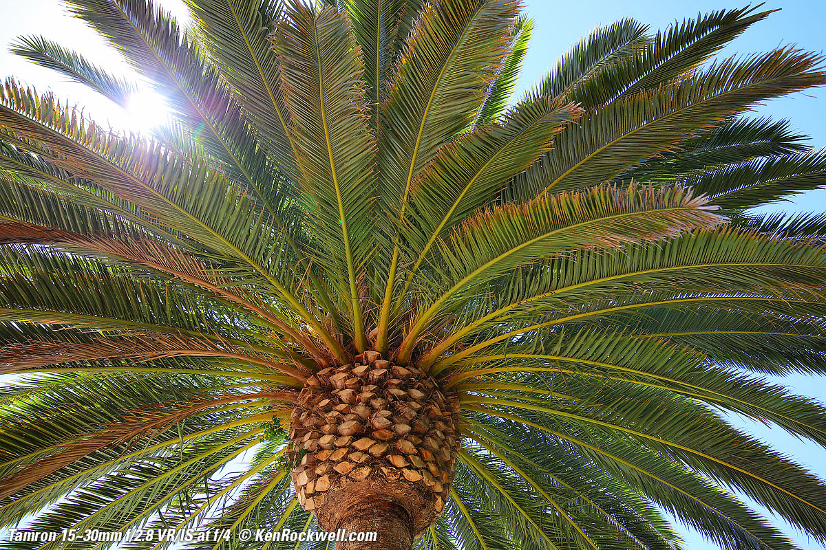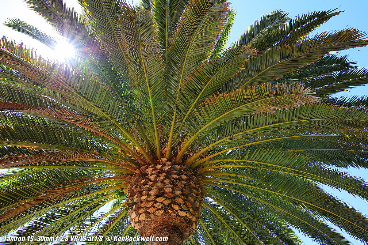 Flare & GhostsThis lens is less resistant to ghosting than other lenses, but I doubt you'll see any unless you go out of your way as I did here, with the sun shining directly into my lens and then exposing for the dark shadows of the palm tree. See more reasonable examples at Sunstars. Worse case flare at f/8 and 30mm. bigger.