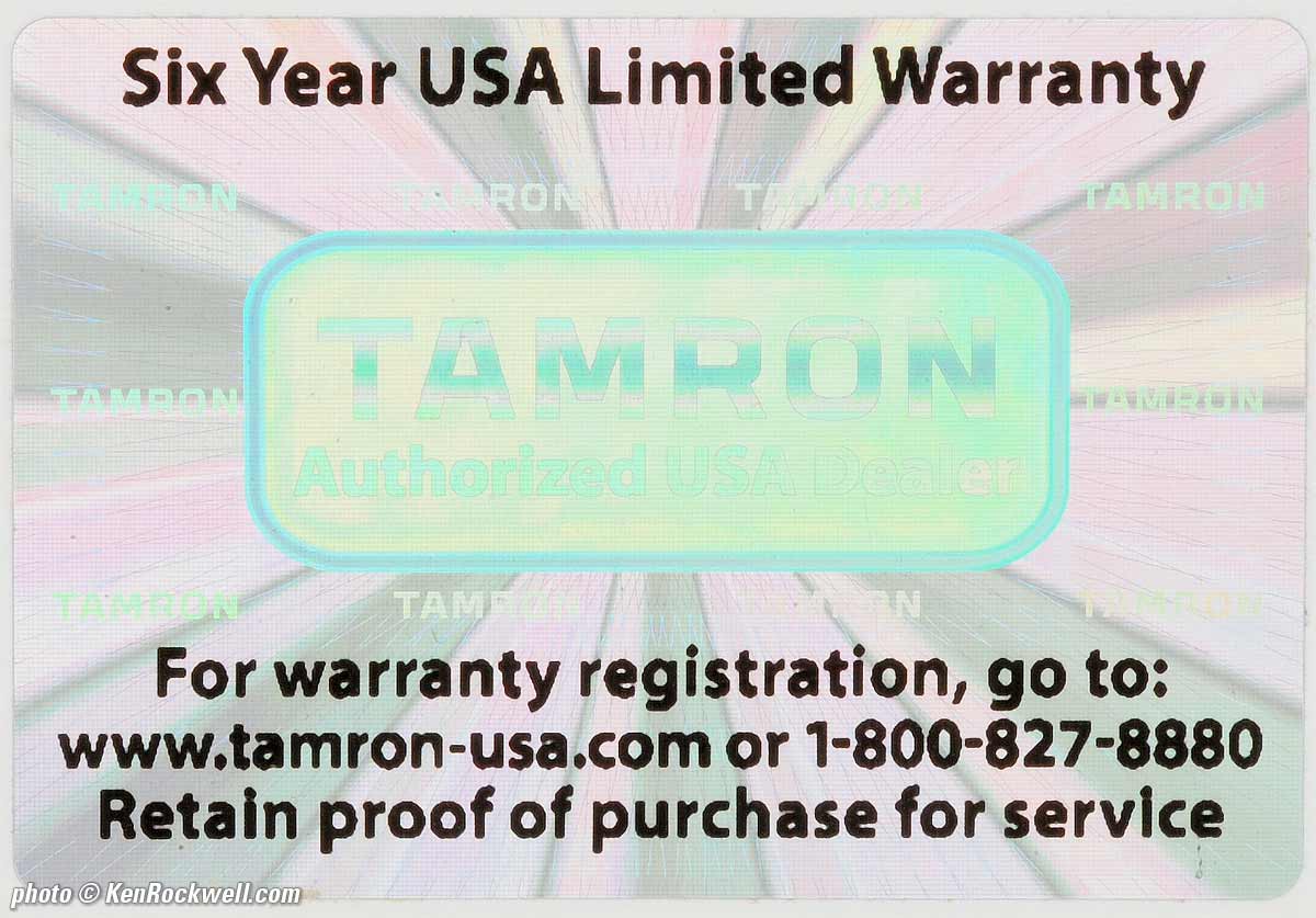 Getting a Legal USA VersionTop Sample Images Intro Format Compatibility Specs USA Version This section applies in the USA only. In the USA, be sure the serial number on your lens (in tiny black-on-black numbers on the bottom of the zoom ring) matches the serial number on the top of the box and on the warranty papers inside the box, and be sure your box has this six-year USA hologram sticker: Tamron USA hologram sticker. bigger. If not, you got ripped off with a gray market version from another country. This is why I never buy anyplace other than from my personally approved sources. You just can't take the chance of buying elsewhere, especially at any retail store, because non-USA versions have no warranty in the USA, and you won't even be able to get firmware or service for it — even if you're willing to pay out-of-pocket for it when you need it! If a gray market version saves you $400 it may be worth it, but for $200 or less I wouldn't risk having no warranty or support. Always be sure to check your box while you can still return it, or just don't buy from unapproved sources or at retail so you'll be able to have your camera serviced and get free updated firmware as needed. Get yours from the same places I do and you won't have a problem, but if you take the risk of getting yours elsewhere, be sure to check everything while you still can return it.