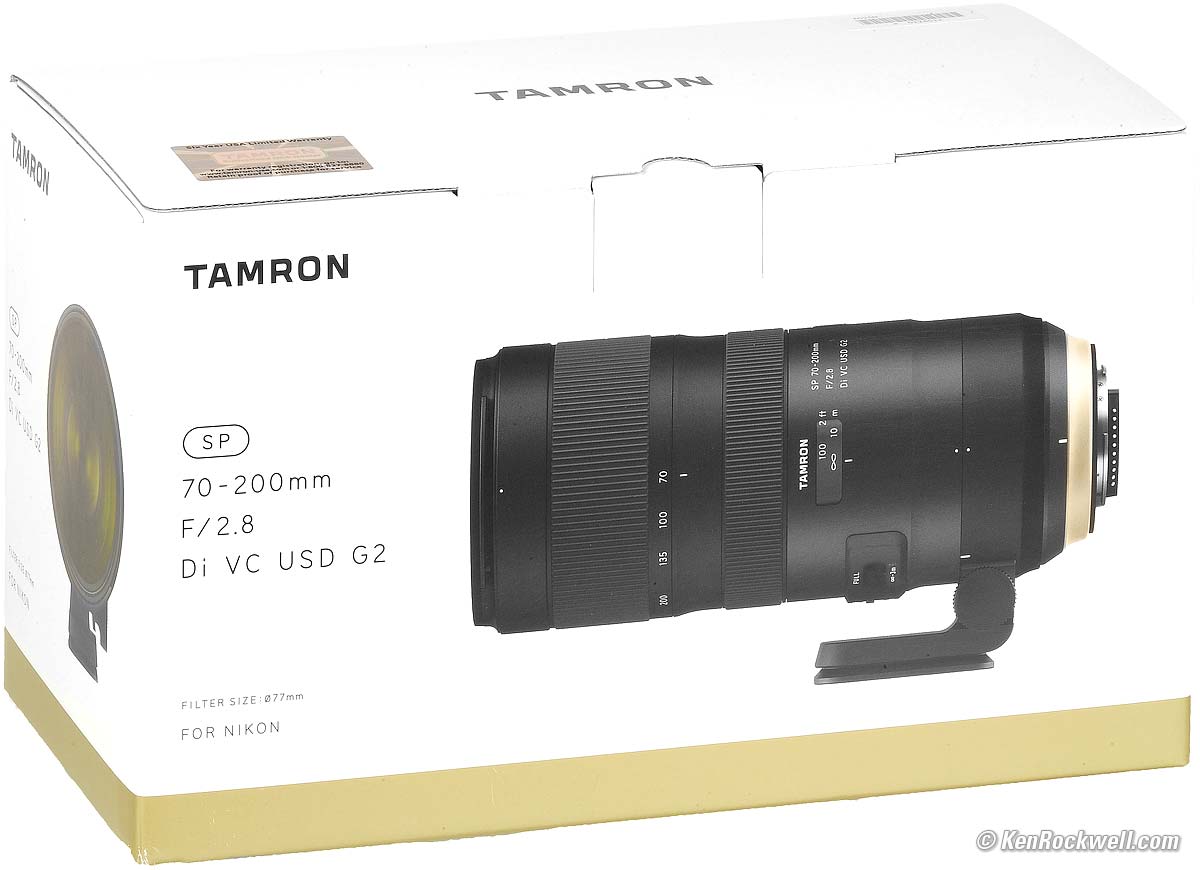 Tamron 70-200mm f/2.8Full-Frame VC G2 (2017-)Sample Images Intro Format Compatibility Specs USA Version Performance Compared Tamron 70-200mm f/2.8 VC G2 (77mm filters, 52.1 oz./1,477g, 3.1'/0.95m close focus, about $1,299) bigger. I got my Nikon version at B&H. I'd also get the Nikon version at Adorama or at Amazon. There is a Canon version at B&H, which I'd also get at Adorama or at Amazon. This all-content, junk-free websites biggest source of support is when you use those or any of these links to my personally-approved sources when you get anything, regardless of the country in which you live. Tamron does not seal its boxes in any way, so never buy at retail or any other source not on my personally approved list since you'll have no way of knowing if you're missing accessories, getting a defective, damaged, returned, non-USA, store demo or used lens. Get yours only from the approved sources I use myself for the best prices, service, return policies and selection. Thanks for helping me help you! Ken. April 2018 Sony Sony Lenses Zeiss Nikon Canon Fuji LEICA All Reviews Nikon 70-200mm f/2.8 FL VR FX (check price) Nikon 80-200mm f/2.8D FX (check price) Canon 70-200mm f/2.8 L IS II (check price) Canon 100-400mm L IS II (check price)