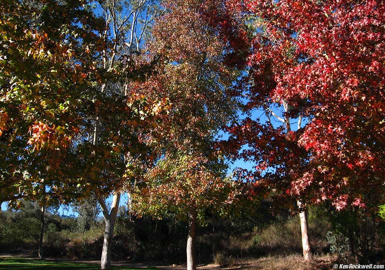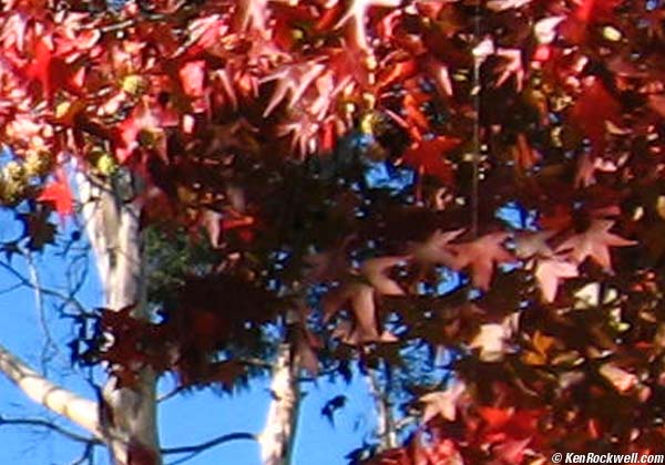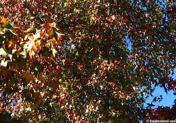 goodies at Ritz, Amazon and Adorama. December 2006 July 2007: Also see A Comparison Between a $5 Film Camera and a $3,200 Digital Camera. Skip to: How I Did This Performance Enlargements Recommendations Here's an example of how a $150 camera can make the same photo as any other exotic camera. Roll your mouse over the image to swap between the two images. Which do you think is which? Which has better color? Which has better sharpness? Which has better highlight detail? Which has better noise performance? Roll your mouse over to compare a photo made with a $150 camera to a $5,000 camera. Sorry about the change in tilt; I used a tripod for the $5,000 camera and hand-held the $150 one. I think the better shot actually came from the cheap camera, which is the first image. Yes, if you are a geek with a microscope there are differences, but that's for geeks who look for these details as a hobby unto itself. For normal people who actually enjoy photos there isn't any difference for 80% of what you might want to shoot. Many people who read my site buy and own too many cameras. They enjoy dissecting photos for engineering details (as I often do on this site) more than they enjoy making photos. They're often the same guys who buy too many other toys. Those are the people who keep insisting you buy a more expensive camera, since it justifies their perverted hobby. It doesn't make any better photos. The $150 camera made the first shot. The $5,000 camera made the shot seen with your mouse over the image. I prefer the $150 camera in this example. Better cameras may make it easier or more pleasant to make photos, much as a better car makes it more pleasant to get someplace. A rusty Ford Pinto or a Prius gets you there just the same as a V-12 Mercedes. HOW I DID THIS back to top Introduction How I Did This Performance Enlargements Recommendations One shot was made with the $150 Canon A530. Actually it usually sells in December 2006 for about $139.95, complete with batteries, strap, cables, memory card and software. I don't use a tripod with it. I set it to its Vivid mode (explained on my A530 page). The other camera is my Canon 5D, ($3,299.99 MSRP) and a Canon 16-35mm f/2.8 L lens (1,499.99 MSRP). I had to buy my own memory card ($209), and I chose to use my own Tamrac strap ($25), B+W 77mm UV filter ($54), Gitzo G1227 carbon fibre tripod ($560) and Bogen Manfrotto 3275 410 Geared Head ($194), for a total of $5,842. I set my 5D to normal contrast and +2 color saturation. The more expensive camera costs over forty times as much as the inexpensive one. That's forty, not four. I could buy three of the inexpensive camera systems just for the sales tax on the more expensive one! The 16-35mm L lens was set to 35mm, its sharpest setting, and the A530 was at its widest setting. The two cameras make slightly differently shaped images. The A530's images are a little taller (4:3) and the 5D's images are a little wider (3:2). To get them to fit on top of each other I had to trim a little from the top and bottom of the A530's image, and trimmed the same amount from the sides of the 5D's image. I reduced both images to the same size to fit on your screen. PERFORMANCE back to top Introduction How I Did This Performance Enlargements Recommendations Look for yourself. They look equally as sharp to me. That's my point: at normal sizes, resolution doesn't matter. The $150 A530 is 5MP and the $5,000 5D is 12.7 MP. The A530 obviously has the best pixels-per-dollar value. Either makes great 12 x 18" prints if you shoot well. The color looks much better on the first image. The image you get with your mouse over the image is overexposed, so the colors are washed out. I prefer the warmer shadows on the first image. Which is which? The first one (better color; my favorite) is the $150 Canon A530! The second image (worse color and exposure) is the $5,000 Canon 5D!! This shows the importance of knowing how to use your camera over buying a fancier one. Cameras are just like cars: even if you have a Mercedes with automatic-tailgating, radar-controlled cruise control (Distronic) and navigation, you still need to keep it in lane with the steering wheel. A camera's steering wheel is the Exposure (light-dark) compensation control and the White Balance (color) control. Just like cars, regardless of how automated they are, they all need your help now and then. Why is this? Simple: I set the exposure compensation to -1.0 on the A530 to get the correct exposure. I guessed wrong on the 5D and left it at my usual -2/3 setting. The large amount of shadows in this scene caused each camera to give too much exposure to the bright parts, which washed out the color. The LCD on the $150 A530 is color accurate. The LCD on my $5,000 5D is dim, has little contrast and is too green, so I didn't see this while I was out shooting. I have no idea why the LCDs on Canon's point-and-shoots are so much better than on their SLRs; they just are. If I had left the 5D set as it came out of the box the results would have been much, much worse. The exposure would have been much lighter, and the saturation would have been much lower (0 instead of +2). Here's how the default saturation setting looks: